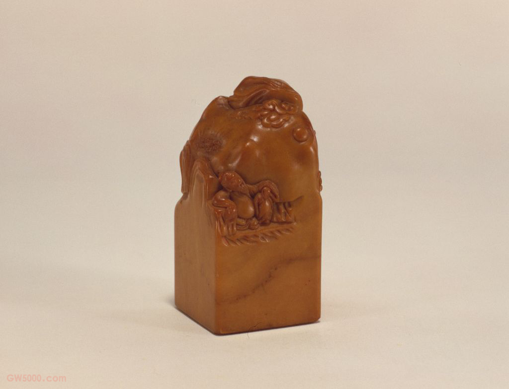 “万国咸宁”玺,清雍正,寿山石质,随形雕山水人物方形玺,汉文篆书。面3.3厘米见方,通高7厘米。