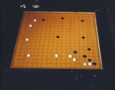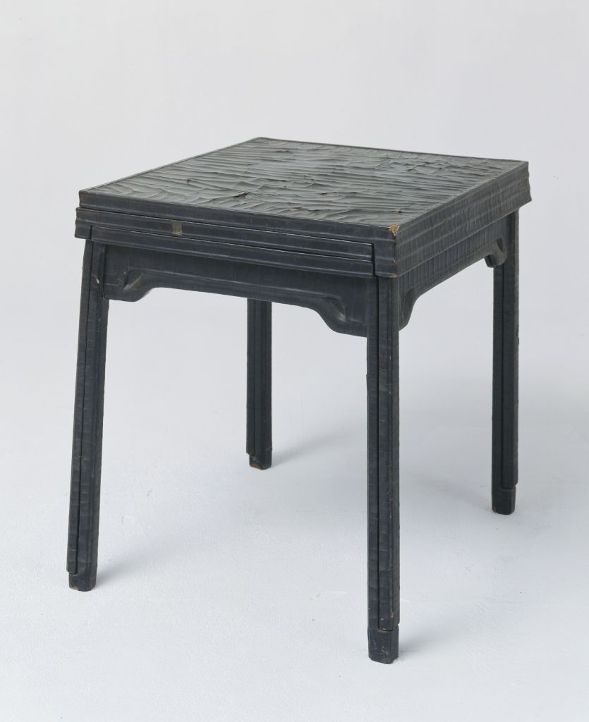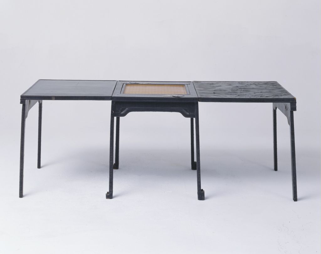明,高84厘米,长84厘米,宽73厘米。 桌通体髹黑色退光漆,桌面上有活榫,合拢是四足木桌,打开后为八足棋桌。罗锅枨式桌牙。桌面边缘起拦水线,正中为活心板,上绘黄地红格围棋盘,背面黄素漆地。棋盘侧镟圆口棋子盒二个,均有盖,内装黑白棋子各一份。棋盘下有方槽,槽内左右各装抽屉一个,内附雕玉牛牌二十四张,雕骨牌三十二张,骨摋子牛牌二份,纸筹二份,摋子筹二份,文台途器一份,均带木匣,又有锡钱二串。黑漆经加工所产生的一种光泽效果。其作法是用生漆经过反复曝晒成为熟漆,再将熟漆髹饰在器物上经打磨退光而成。其特点是光彩内敛,乌黑发亮。古代家具中凡两端低中间高,形如罗锅的枨子皆可称为“罗锅枨”。桌面四边高于面心的线条。书案上必备的小工具,包括刀、剪、锥、锉刀等。