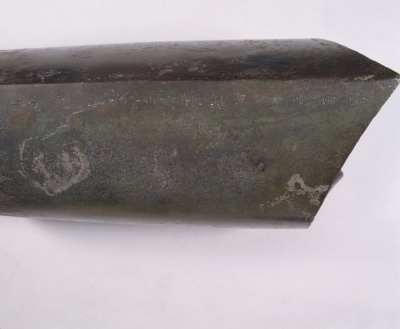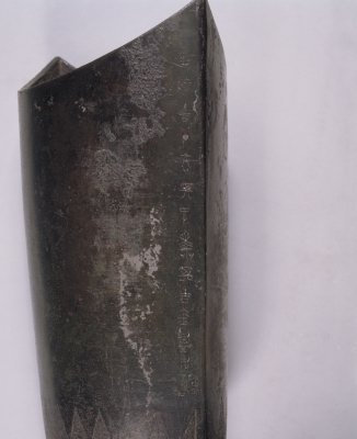 器曲口,腔体窄而深,两侧略倾,长柄。腔体近柄处饰回纹和蕉叶纹。两侧鼓部有铭文32字: