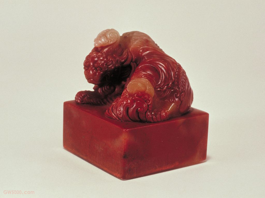 此宝之飞熊纽雕刻精细,为清早期印纽雕刻之代表作品。叶腊石之一种,产于福建福州市郊寿山,因名寿山石。质地细腻,色彩丰富,其中以各种透明或半透明的冻石品质为高。寿山石是雕刻和治印的优良材料。古代传说中的一种瑞兽。据传说有“飞熊入梦”,预兆帝王必得贤臣。 《周易》即《易经》,是迄今最古老的占卜书,其内容对上古社会有所反映,记载了古人的一些思想意识。<BR> 清初在紫禁城皇宫内廷养心殿置造办处。康熙三十年(1691年),除裱房等留在殿内外,其余迁至慈宁宫茶饭房。三十二年(1693年)开始设立作坊。四十七年(1708年)全部迁出养心殿,后又将部分作坊设在慈宁宫南、白虎殿(今废)北的一带青瓦建筑里,负责制造各种物品。造办处设管理大臣2人,总管郎中2人,员外郎2人,主事、委署主事各1人,库掌、委署库掌24人,笔帖式15人。还设首领太监2名,太监21名,负责造办处匠役进宫修造事宜。造办处下设馆、处、作、厂等作坊,分工明确,设催长、副催长、委署司匠、库守、苏拉等,承应各项差务,所属各种匠役约二百名。据《钦定大清会典事例》记载:“养心殿造办处……掌制造器用,凡治器之作十有四……” 全称“总管内务府”,是清代掌管皇家事物的最高管理机构。始设于清初。顺治十年(1653年)六月裁内务府,改设十三衙门。顺治十八年(1661年)废十三衙门,重设内务府。康熙十六年(1677年)内务府初具规模,下设七司三院:广储司、都虞司、掌仪司、会计司、庆丰司、营造司、慎刑司、上驷院、武备院、奉宸苑,其职能与国家机构中的六部相对应。另有分支机构一百三十余处。