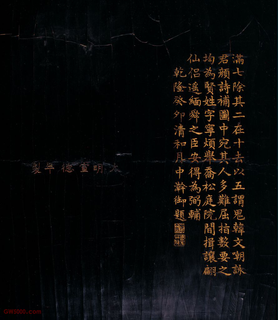 盘委角方形,随形圈足。盘心在天、水、地三种锦纹上雕五老图。盘内外壁每面雕一种花,分别是茶花、牡丹、菊花和石榴花纹。底髹黑漆,中央刀刻填金“大明宣德年制”楷书款。右侧有乾隆御制诗《咏宣徳雕漆五君子盘》:“满七除其二,在十去以五。谓鬼韩文嘲,咏君颜诗补。圗中宛其人,多难屈指数。要之均为贤,姓字宁烦举。乔松庭 院间,揖让翩仙侣。遥缅舜之臣,安得为弼辅。乾隆癸卯清和月中澣御题。”下钤“会心不远”、“德充符”二方章。