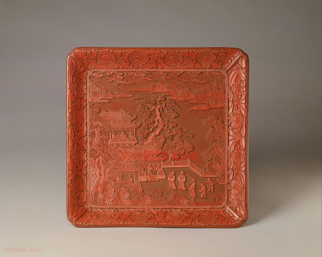 此盘的画面构图、雕工磨制与永乐朝漆器几近相同,是永乐朝雕漆的延续。它是目前所见明早期方盘中体量最大者,非常珍贵。雕漆品种之一,又名“雕红漆”或“红雕漆”。此技法成熟于宋元时期,发展于明清两代。明黄成《髹饰录·坤集·雕镂第十·剔红》中写道:“剔红,即雕红漆也。……宋元之制,藏锋清楚,隐起圆滑,纤细精致。”其法常以木灰、金属为胎,在胎骨上层层髹红漆,少则八九十层,多达一二百层,至相当的厚度,待半干时描上画稿,然后再雕刻花纹。一般以锦纹为地,花纹隐起,华美富丽。根据漆色的不同,有剔红、剔黄、剔绿、剔黑、剔彩、剔犀之分,其中以剔红器最多见。家具中线角术语。一般的桌面、几面、案面均为直角,将四个直角改为小斜边而成八角形的做法,北方木工称为“委角”,江南木工称“劈料做”。 髹漆工艺之一,亦称刻漆。其工艺技法是在胎体上层层髹漆,少则几十层,多则百层以上,然后在漆上雕刻花纹。其胎以木质居多,漆色有红、黄、绿、酱等。
