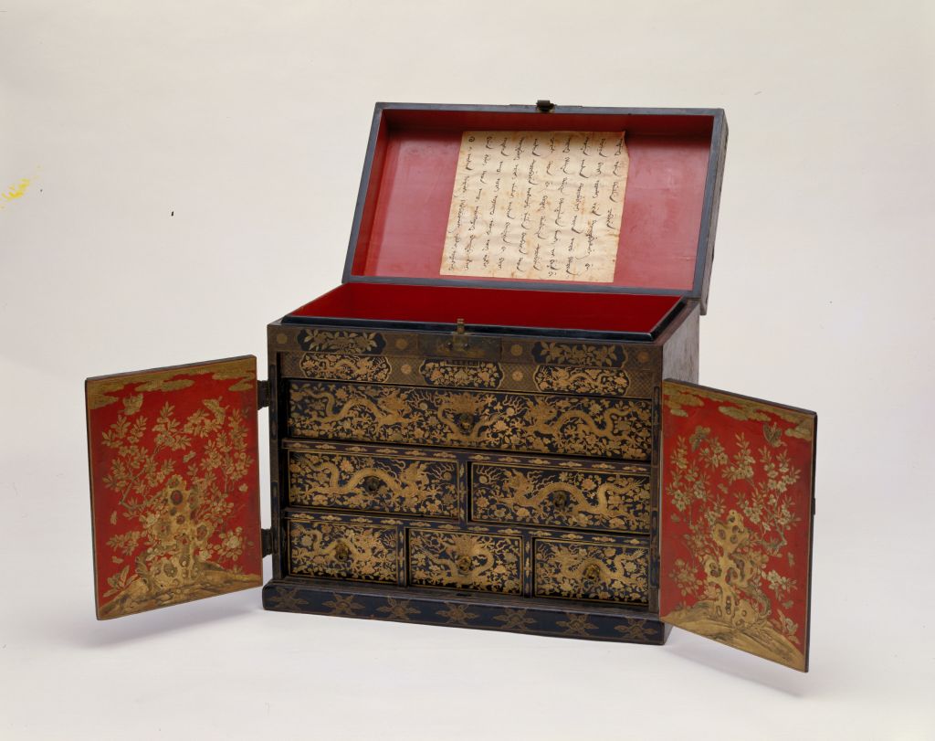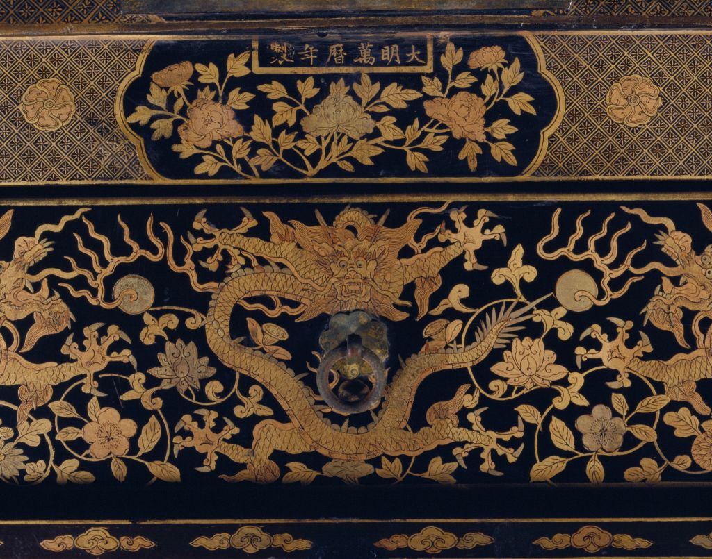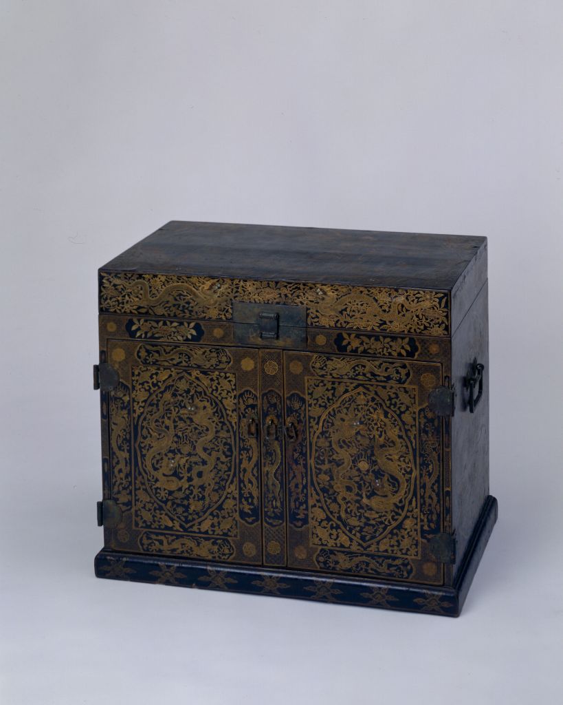明万历,横73厘米,纵41.5厘米,高63厘米。 柜上开盖,盖内有屉,前沿有插销,可管住两门间的活插栓。柜盖四周描金行龙,间布串枝牡丹花。下设对开门,门心及两山、后背、盖面均作菱形开光装饰,内为双龙戏珠纹,外围布缠枝花纹。柜下侧有突出柜身的柜座。在活插栓内横梁正中,有描金“大明万历年制”六字款。瓷器装饰手法之一。其工艺是以毛笔蘸调和好的金粉,在烧好的瓷器上描绘图案花纹,然后入炉经低温烘烧而成。描金创烧于北宋定窑,南宋人周密《志雅堂杂钞》记载:“金花定碗用大蒜汁调金描绘,然后再入窑烧,永不复脱。”用大蒜汁调和金粉是利用其天然的粘性。明清的景德镇御窑厂亦常用描金装饰颜色釉瓷器,如著名的宣德鲜红釉描金器、弘治黄釉描金器、乾隆窑变釉描金器等。 一种中国古代传统图案,又称“跑龙”。龙的造型特点是,龙头向前,尾在后,头为侧面,四肢两前两后、各为一蹬一伸。中国传统花纹形式之一。花朵竖向串联成条状。有串枝莲、串枝萱草、串枝花卉等。 我国瓷器普遍采用的装饰手法之一。宋代以后较为流行。一般是在锦地上有规则地空出数量不等、形状各异的白地,用线条勾出轮廓,称为开光。开光内绘各种纹饰。在一件器物上有二、三、五、六、八数目不等的开光,开光形状有长方形、方形、菱花形、扇形、桃叶形等。其艺术效果是使开光内的纹饰更加鲜明突出。宋金时期河北磁州窑、陕西耀州窑、江西吉州窑都采用开光这一装饰方法,有的不采用锦地,直接在器物上刻划开光,用以突出器物的主题纹饰,增强装饰效果。 我国传统装饰技法之一。即为使器物上的装饰变化多样或突出某一形象,往往在器物的某一部位勾勒出某一形状(如扇形、蕉叶形、菱形、心形、桃形、圆形等)的空间,其内饰以图纹。 中国传统装饰花纹之一。所绘花朵系以植物的枝干或蔓藤作骨架,枝叶相互缠绕,构成四方连续或二方连续的图案,统一中寓变化。有缠枝莲、缠枝菊、缠枝牡丹和缠枝宝相花等多种纹样。