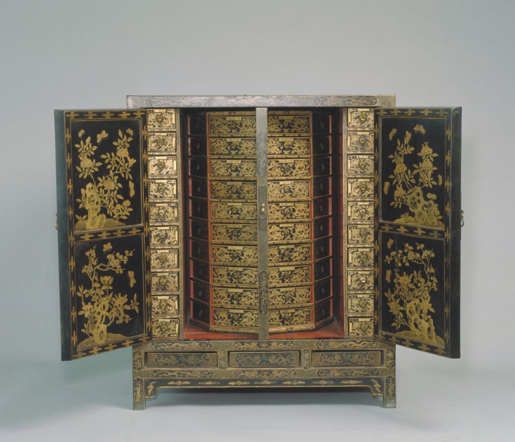 明万历,高94.5厘米,横78.8厘米,纵57厘米 。 柜四面平式,对开柜门,柜门下接三个明抽屉。柜内为抽屉架:中心为八方转动式抽屉,上下安架,每面十个,两侧又各有一列十个抽屉。抽屉每个内分三个,因此本药柜可盛放药品达一百四十种。屉面上有涂金名签,标明中药名称。药柜通体黑漆描金,外部以龙纹装饰为主,柜门内侧则描绘花卉图案。药柜背面有泥金填刻楷书“大明万历年造”六字款。在黑色漆地上加描金花纹的工艺技法。瓷器装饰手法之一。其工艺是以毛笔蘸调和好的金粉,在烧好的瓷器上描绘图案花纹,然后入炉经低温烘烧而成。描金创烧于北宋定窑,南宋人周密《志雅堂杂钞》记载:“金花定碗用大蒜汁调金描绘,然后再入窑烧,永不复脱。”用大蒜汁调和金粉是利用其天然的粘性。明清的景德镇御窑厂亦常用描金装饰颜色釉瓷器,如著名的宣德鲜红釉描金器、弘治黄釉描金器、乾隆窑变釉描金器等。 陶瓷器装饰纹样之一种。明、清两代是陶瓷器以龙纹为装饰的全盛时期,主要采用釉上、釉下彩绘方法,亦有印花、刻划等工艺。龙的体态有较多变化,常见有云龙、戏珠龙、海水龙、螭龙、行龙、立龙、正面龙、侧面龙、夔龙等。指形似书匣的方角柜。 我国传统装饰技法之一。即为使器物上的装饰变化多样或突出某一形象,往往在器物的某一部位勾勒出某一形状(如扇形、蕉叶形、菱形、心形、桃形、圆形等)的空间,其内饰以图纹。 一种用金箔和胶水制成的金色颜料,用于书画、髹漆等方面。指在金色花纹上用黑漆描纹理,全称“黑漆理描金”。