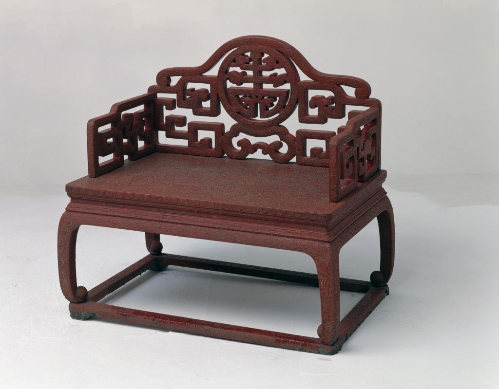 明末清初,通高102厘米,横101.5厘米,纵67.5厘米。 宝座搭脑凸出,靠背透雕夔龙捧寿纹,两侧扶手亦透雕夔纹,座面边框雕回纹,座面下束腰上雕刻连回纹,有托腮,直牙条,鼓腿膨牙,内翻卷珠式足,下承托泥。 此宝座无论靠背、扶手还是座面、腿牙之上均雕刻缠枝花纹,枝叶满布,密不露地,从雕刻风格看,应为明末清初的作品。雕漆品种之一,又名“雕红漆”或“红雕漆”。此技法成熟于宋元时期,发展于明清两代。明黄成《髹饰录·坤集·雕镂第十·剔红》中写道:“剔红,即雕红漆也。……宋元之制,藏锋清楚,隐起圆滑,纤细精致。”其法常以木灰、金属为胎,在胎骨上层层髹红漆,少则八九十层,多达一二百层,至相当的厚度,待半干时描上画稿,然后再雕刻花纹。一般以锦纹为地,花纹隐起,华美富丽。根据漆色的不同,有剔红、剔黄、剔绿、剔黑、剔彩、剔犀之分,其中以剔红器最多见。夔,古代传说中一种奇异的动物,似龙,一足。《庄子·春秋》中记载:“夔谓蚿曰:‘吾以一足趻踔而行。’”夔纹即这种独脚龙的侧面图案。玉器上的夔纹,最早见于商、西周时期,多见于彝器上。夔纹在玉器上出现的时间很长,自商、周至今,一直在玉雕工艺纹饰中占据着重要地位,而在战国和汉代尤为兴盛。玉器上的夔纹线条比青铜器上的柔和,阴刻线除单线外,也有双刻线。 传统家具中一种体型宽大的坐具,亦称“御座”。明以后,随着皇权制度的强化,宝座成为帝王御用坐具的代名词,象征着帝王的权威。《明史》载,明神宗时,宦官冯保窃权,“帝御殿,保辄侍侧”。当时的吏部都给事中雒遵进言:“保一侍从之仆,乃敢立天子宝座,文武群工拜天子耶,抑拜见中官耶?”将宦官立于宝座之侧视为亵渎皇权的大不敬行为。 宝座大多摆放在宫廷正殿明间的中心或显要位置,单独陈设,极少成对。在宝座的背后还要放置一个较大的座屏,两边放置甪端、香筒、仙鹤、蜡钎等器物,格外尊贵、庄严。皇帝端坐在宝座之上,俯视群臣,“君临天下”,充分体现出帝王的权威,以达到“明制度,示等威”的目的。装在椅背或衣架之上用于连接立柱和背板的构件。椅背搭脑一般正中稍高并略向后卷,以便人们休息时将头搭靠其上,故名。亦称欹床。中国传统家具中的一种坐具,现已很少见。其形式犹如椅子的靠背,是一种无座腿甚至无座面的坐具。其背后安有可以撑放的活动支架,可根据使用者的要求调节靠背的角度。它多在床榻上或席地使用。明高濂《遵生八笺》中说:“靠背以杂木为框,中穿细藤,如镜架然。高可二尺,阔一尺八寸,下作机扃,以准高低,置之榻上,坐起靠背,偃仰适情,甚可人意。”宋、明绘画中也可见到此种坐具。 雕刻技法之一。一种是在浮雕的基础上镂空背景部分,有单面雕、双面雕之分。另一种介于圆雕和浮雕之间,常用于民间床、窗、梁、护板的雕刻中。 我国传统的装饰纹样之一。夔,神话中形似龙的兽名。《庄子·秋水》中言:“夔怜蚿,蚿怜风。”释文:“夔,一足兽也。……其状如牛,苍色无角,一足能走,出入水即风雨,目光如日月,其音如雷,名曰夔。” 家具上常用的纹饰之一,由陶器和青铜器上的雷纹衍化而来,寓意吉利深长,苏州民间称之为“富贵不断头”。在家具上,回纹主要作为边饰,用于边框、牙条、足端或束腰等处。家具上大量采用回纹见于清代。束腰,明清家具部件名称。原是须弥座上枭与下枭之间的部分,在家具上指面框和牙条之间缩进的部。束腰是我国传统家具造型的典型式样之一。束腰与牙条之间的托层。有些束腰家具,束腰与牙条不衔接或衔接甚少,不能起到支撑作用,这时在两者之间加一木条过渡,使结构更加合理。很多家具在立木与横木的支架交角处多运用形式不同的牙子来装饰。这种牙子中长而直的称为牙条。带束腰家具中常见的一种装饰手法。四腿自束腰下向外鼓出,然后又向内兜转,形成内翻马蹄状,牙板亦随腿的弧度向外膨出。 传统家具上承接腿足的部件。明清家具中有的腿足不直接着地,另有横木或木框在下承托,此木框即称为“托泥”。有的托泥之下还有小足,小足才是真正落地的部位。此部件多见于条案、几类等传统家具,以增稳重之感。中国传统装饰花纹之一。所绘花朵系以植物的枝干或蔓藤作骨架,枝叶相互缠绕,构成四方连续或二方连续的图案,统一中寓变化。有缠枝莲、缠枝菊、缠枝牡丹和缠枝宝相花等多种纹样。