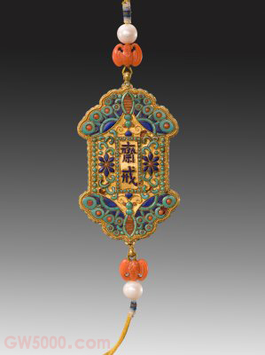 金嵌玉石斋戒牌,清,通长9.5厘米,宽5.2厘米,厚0.5厘米。 斋戒时用的祭器。《清会典》载:“斋戒牌木制,饰以黄纸,以清汉文书斋戒日期。”皇帝在宫中斋戒时,设于斋宫丹陛左侧。斋戒之日,皇帝与王公大臣也必须佩戴斋戒牌。这种斋戒牌“广一寸,长二寸,书清汉斋戒字,佩著心胸之间。”形制质地也各有不同,有方形,也有圆形;有玉质、木质,也有象牙质的。 古人于祭祀之前,沐浴更衣,不饮酒,不作乐,不吃荤,整洁心身,以示敬诚,称为斋戒。