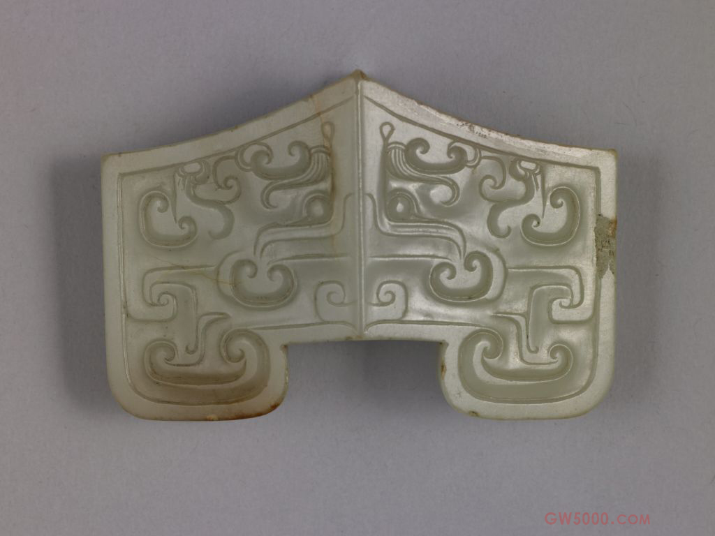 玉为青色,局部有褐色。器形中间厚,两端薄,两侧面为菱形,中部一椭圆形穿孔。两面采用剔地阳雕技法饰兽面纹及勾云纹。