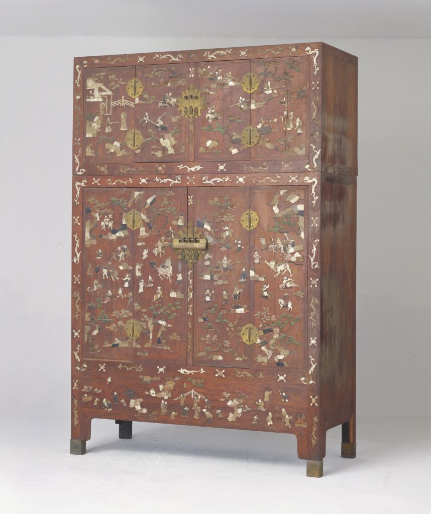 明末清初,高272.5厘米,横187.5厘米,纵72.5厘米。 柜以黄花梨木包镶,分为上下两部分,并各装四门,正中可开,两侧可卸,门上装铜合页与铜锁鼻。柜面用螺钿、田黄石等嵌出各种人物、异兽、山石、花木,上层为历史故事画,下层为番人进宝图,柜肚为婴戏图,边框饰螭龙纹。方足铜包脚。 此类柜又称顶箱立柜,由底柜与顶柜两部分组成。一般成对摆设,所以又称四件柜。此柜即为成对柜之一。柜面所嵌饰件高于面板,具有立体感。于黄花梨材上作镶嵌装饰,在家具工艺中较为少见。明清时期制作高档家具的木料品种之一。又称老花梨,黄檀属木类。我国海南岛有此树种,又名“海南檀”,现为国家一级保护植物。一种工艺名称。系用各种珍贵材料如翡翠、玛瑙、珊瑚、青金、象牙、松石等制成各种浮雕形象,镶嵌于木或漆器之上,其作大如屏风、书柜,小如笔筒、砚盒,色彩艳丽、构图精美。明嘉靖时扬州有周翥擅长此技,钱泳《履园丛话》云:“周制之法,惟扬州有之。明末有姓周者,始创此法,故名周制。”清乾隆时期有王国琛、卢映之,其后又有卢葵生等名家辈出,其作品名噪一时。 包镶指用一般木材造胎骨、以薄片硬木造贴面的家具工艺。中国传统装饰工艺之一,即指将螺、贝、蚌等软体动物的体壳加工成薄片,刻划并拼组成花草、人物、鸟兽等纹样,镶嵌于漆、木等器物表面的装饰技法,也作“螺甸”、“螺蜔”、“螺填”、“陷蚌”等。其起源甚早,在陕西、河南、北京等地发掘的西周墓葬里都出土过镶嵌蚌泡的漆器,有的学者认为这就是螺钿工艺的滥觞,目前所见比较成熟的螺钿器物是出土于唐墓内的漆背螺钿铜镜和收藏在日本奈良正仓院的螺钿玳瑁八角盒、螺钿紫檀琵琶等。宋代的螺钿器物比较普遍,《髹饰录》所记的“壳片古者厚而今者渐薄”的薄螺钿(或称软螺钿)工艺,一般认为就是在此时开始出现,并逐渐占据主流位置,同时厚螺钿(或称硬螺钿)工艺也并未消失,在大型家具的装饰中还形成独特风格。元明时期,螺钿工艺所使用的贝壳品种更为丰富,加工更为精细,发展出加彩漆、描金、金箔、金银嵌错和加“沙”(即撒壳屑)等辅助手法,创造出五色斑斓的效果,正如《髹饰录》所言:“百般文图,点、扶、钩、条,总以精细密致如画为妙。”至17世纪,螺钿工艺达到高峰,产生了江西吉安等主要产地,涌现出江千里、方信川等著名匠人。入清后,薄螺钿工艺进一步向轻巧细致发展,受嵌器物的材质也趋于多样,除漆、木外,玉石、象牙、金属等都有嵌螺钿装饰的实例。清中期以后,螺钿作为百宝嵌工艺中诸多镶嵌材料的一种,往往与宝石、玉翠、象牙等共同出现,单独的螺钿器反而少见了。清代螺钿工艺产地可能集中在扬州、广州等地,内廷造办处也能制作,名匠见诸记载的则有王国深、卢映之、卢葵生等人。柜肚为立柜底部的闷舱部分。打开下层柜门,下层隔板与柜底的空间部分即柜肚,一般用来存放不常用的物件。陶瓷器装饰纹样之一种。明、清两代是陶瓷器以龙纹为装饰的全盛时期,主要采用釉上、釉下彩绘方法,亦有印花、刻划等工艺。龙的体态有较多变化,常见有云龙、戏珠龙、海水龙、螭龙、行龙、立龙、正面龙、侧面龙、夔龙等。 我国古代金工传统工艺之一。铸造铜器时,在需镶嵌部位表面铸成线槽,将松石、红铜片或金银丝、片嵌入凹槽,再打磨平滑。镶嵌工艺始于二里头文化时期,在春秋时期较盛行。