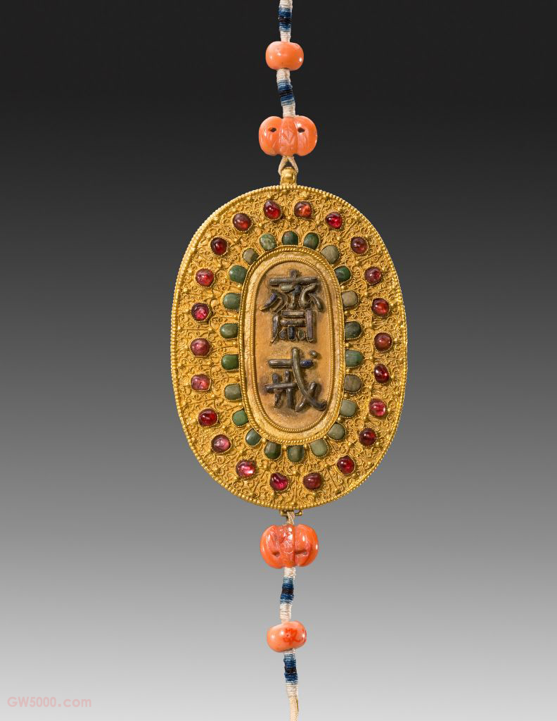 金嵌石斋戒牌,清,长8厘米,宽5.5厘米,厚0.8厘米。 斋戒时用的祭器。《清会典》载:“斋戒牌木制,饰以黄纸,以清汉文书斋戒日期。”皇帝在宫中斋戒时,设于斋宫丹陛左侧。斋戒之日,皇帝与王公大臣也必须佩戴斋戒牌。这种斋戒牌“广一寸,长二寸,书清汉斋戒字,佩著心胸之间。”形制质地也各有不同,有方形,也有圆形;有玉质、木质,也有象牙质的。 古人于祭祀之前,沐浴更衣,不饮酒,不作乐,不吃荤,整洁心身,以示敬诚,称为斋戒。
