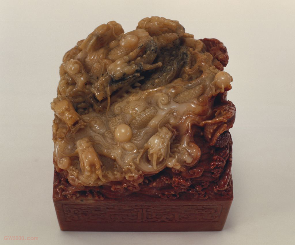 “雍正敕命之宝”,清雍正,寿山石质,九龙纽方形玺,汉文篆书。面12.4厘米见方,通高11.5厘米,纽高6厘米。