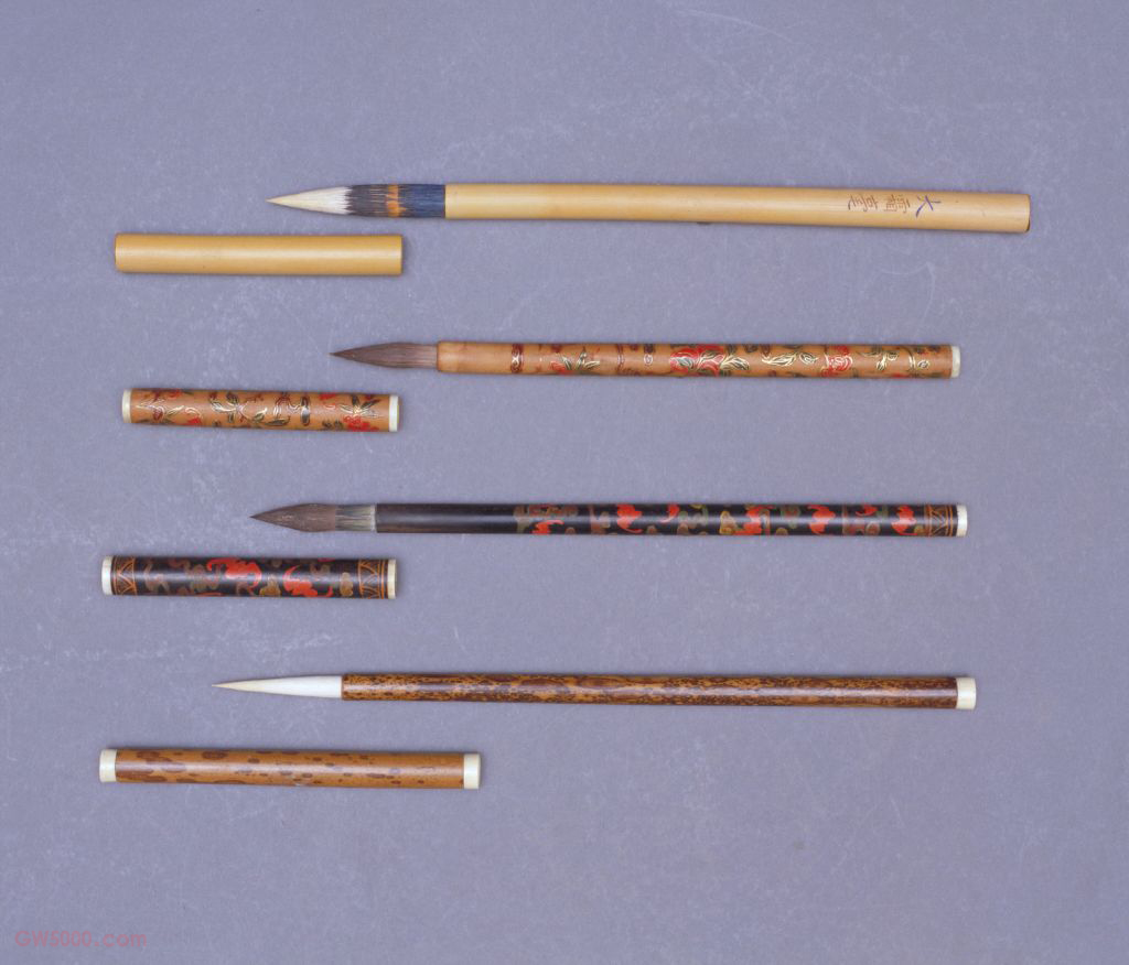 竹管大霜毫笔,清早期,长26.4厘米,径1.3厘米。 笔竹管。管上端阴文填蓝楷书“大霜毫”,字体舒展。顶部贴锦装饰。笔头长硕丰满,锋光润,色如霜雪,副毫染为蓝、褐、橘三色,层次分明,有斑驳之美。此笔的制作简约而不失精细。 宋代的《负喧野录》记载:“韩昌黎为《毛颖传》,是知笔以兔颖为正,然兔有南北之殊,南兔毫短而软,北兔毫长而劲,生背领者,其白如雪霜,作笔绝有力。”这段文字说明,古代用于制笔的兔毫,不仅有紫色、花色的,尚有白色的。“大霜毫”之名是对白色兔毫毛笔的形象称谓。篆刻的一种方式,即把印文镌成凹状,在纸上钤盖时印文是白色,因而又称为白文。