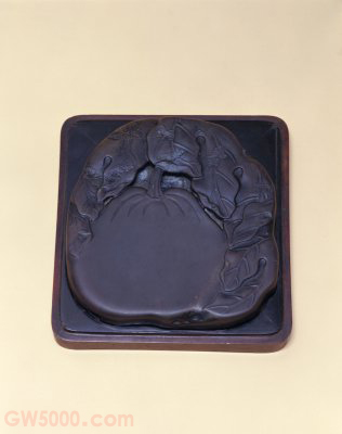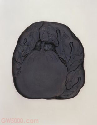 万斯同铭端石瓜式砚,清初,长20.4厘米,宽18.9厘米,厚3.1厘米。 砚端石制,紫色,随材成形。砚堂琢为一瓜,肥大的叶子遮成砚边,叶上有斑斑蛀痕。瓜蒂处镂雕出砚池。砚背阴文篆书题“维彼瓜瓞,载咏绵绵,根深蒂固,于万斯年”,末署阴文楷书“万斯同铭”,并刻“季”“野”篆书印;左下方镌篆书“山阴吴氏珍玩”款,吴氏乃万斯同后又一鉴藏者。 此砚造型厚重,构思巧妙,颇具情趣。雕刻刀法简洁流畅,圆润无锋,于浑朴随意中表现出工匠纯熟的技艺,反映出明末清初的制砚风格。万斯同(1638—1792年),字季野,号石园,浙江鄞县人。清代史学家,博通诸史。康熙十八年(1679年)以布衣身份入史局,参修《明史》。他拟类分题,制定体例,对《明史》的贡献甚大。著有《历代史表》、《儒林宗派》等书。 端石产在广东省肇庆市东南烂柯山西麓端溪水一带。肇庆古称端州,此处石料制成砚台称之“端砚”。端砚是我国四大名砚之首,是著名的实用工艺美术品。用于书画已有一千三百多年历史,自唐宋时即已开采端石制砚。各岩坑所产砚石特点各异,有著名的青花、胭脂晕火捺、蕉叶白、石眼等天然纹理。端石制砚石质之细以达到“温润如玉、眼高而活、分布成象、磨之无声、贮水不耗,发墨而不损毫者”为佳品。 砚的中心研墨处。为砚较为空白开阔的部位,又称墨堂、砚心。此处便于研墨,利于旋转,易于运动。砚的实用价值即视砚堂处石质的好坏而定。 1.雕塑的表现手法之一,即在浮雕的基础上,为了生动地表现物象,局部圆雕,使其脱离背景,形成镂空。 2.瓷器装饰技法之一,也称“镂花”、“镂空”或“透雕”。将装饰花纹雕空,形成内外通透的图案。此技法出现在新石器时代陶器上,后在瓷器纹饰上广泛使用。 砚面贮墨汁处,或称墨池,多为深凹小池。砚池多有富于装饰性者,以安排之巧、形状之奇或纹饰雕刻取胜。篆刻的一种方式,即把印文镌成凹状,在纸上钤盖时印文是白色,因而又称为白文。