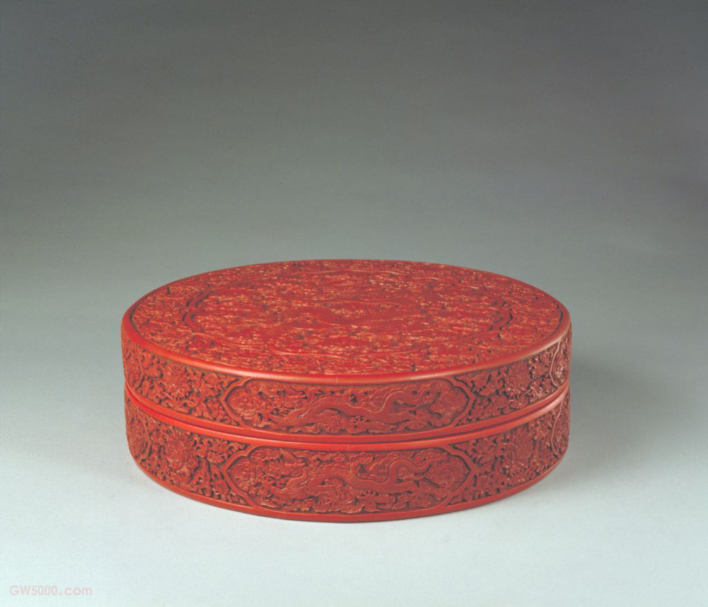 剔红九龙纹圆盒,明宣德,高8.2厘米,直径19.8厘米。清宫旧藏。