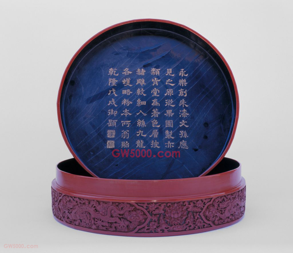 盒木胎,圆形,平顶,直壁,平底,卧足。通体在黄漆素地上雕红漆花纹。盖面饰云龙纹,龙发前冲,闭口,体弯曲劲健,双睛以黑漆点染。器壁饰云纹。盒内及外底均髹黑光漆,填金御制诗:“永乐创朱漆,文孙应见之。原从果园制,亦类肯堂为。着色层披赭,雕纹细入丝。九龙各蠖略,粉本所翁贻。乾隆戊戌御题。”并“乾”、“隆”两方小印。外底左侧边镌刻填金楷书“大明宣德年制”竖行六字款。