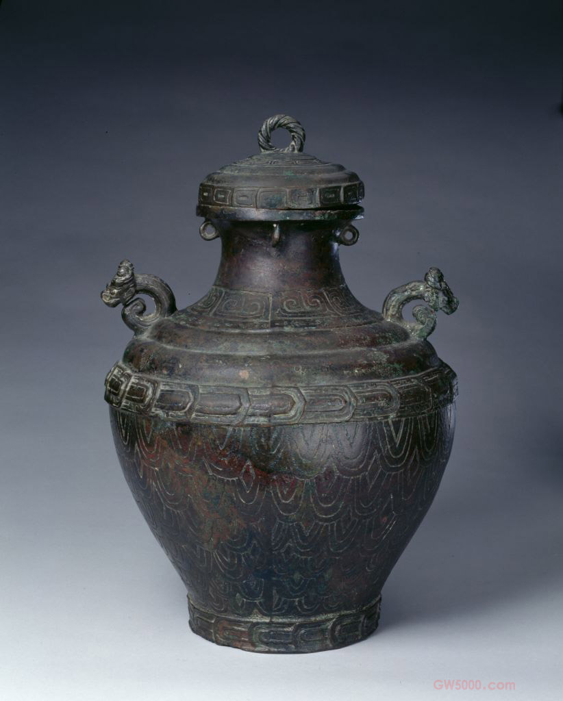 是以龙蛇体躯上的鳞片排列而组成的纹饰,排列的方式有连续式、重叠式、并列式三种。连续式是完全相同的鳞片,按纵向交错排列,可铺开一个很大的面。重叠式的鳞纹排列方式如鱼鳞相叠,也是纵向形式。这两种鳞纹,都可作为主纹,一般饰在器物的腹部。并列式是以大小相同或大小相间的鳞片横置作带状,也有作二层横列,这类鳞纹旧称重环纹,一般饰在鼎和簋的腹上部。鳞纹盛行于西周中晚期。1.盛酒器。作为随葬礼器往往与卣或方彝相配,流行于商代至西周中期。