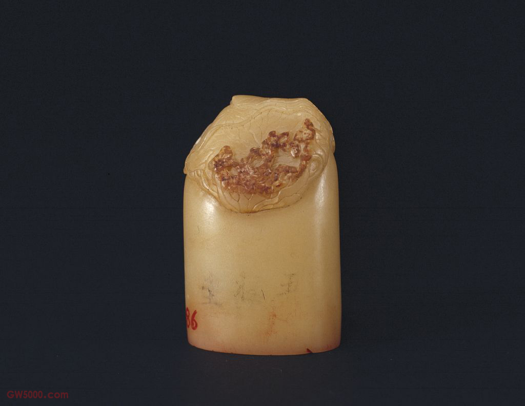 “五福堂”印,清雍正,寿山石质,随形雕荷叶椭圆形印,汉文篆书。面椭圆形,宽2.5厘米,长3.9厘米,通高6.1厘米。