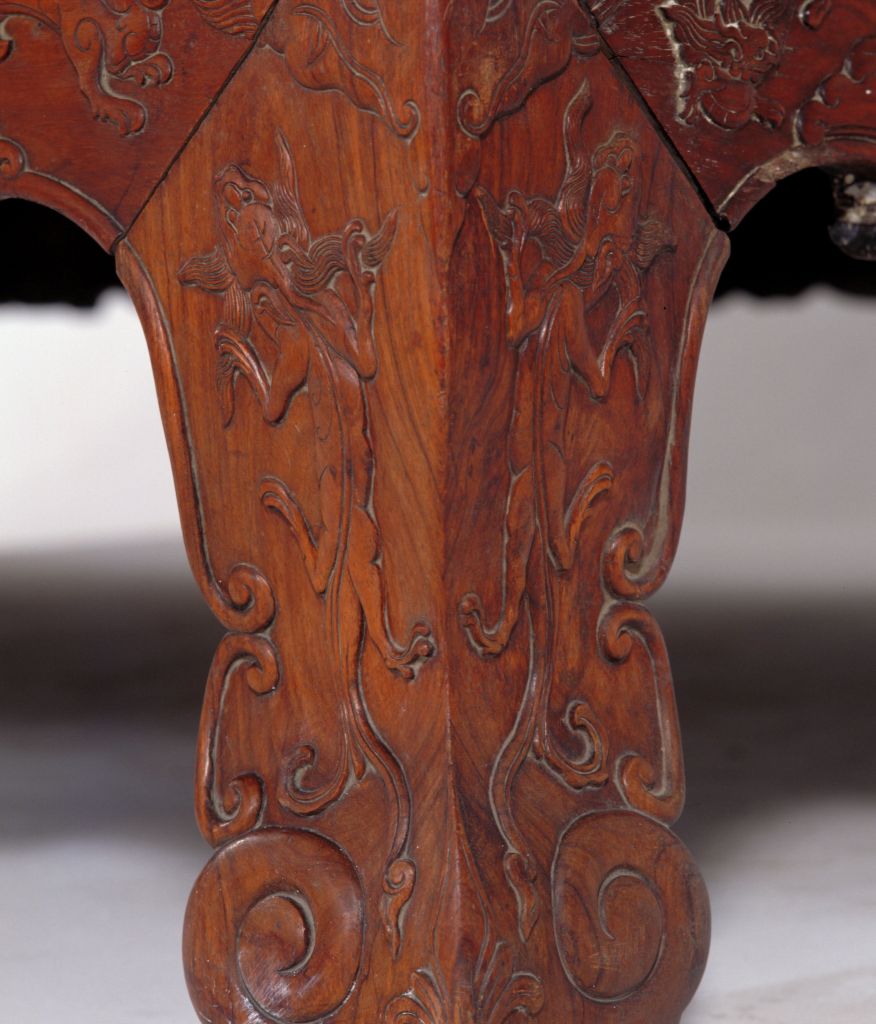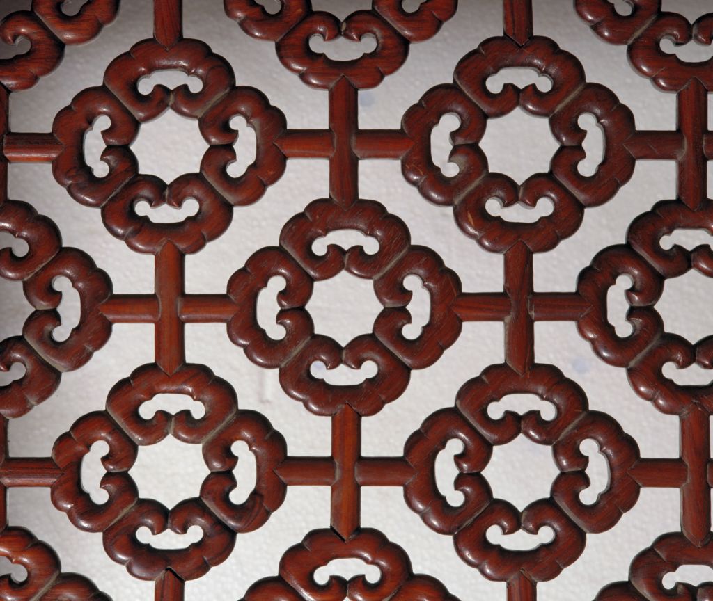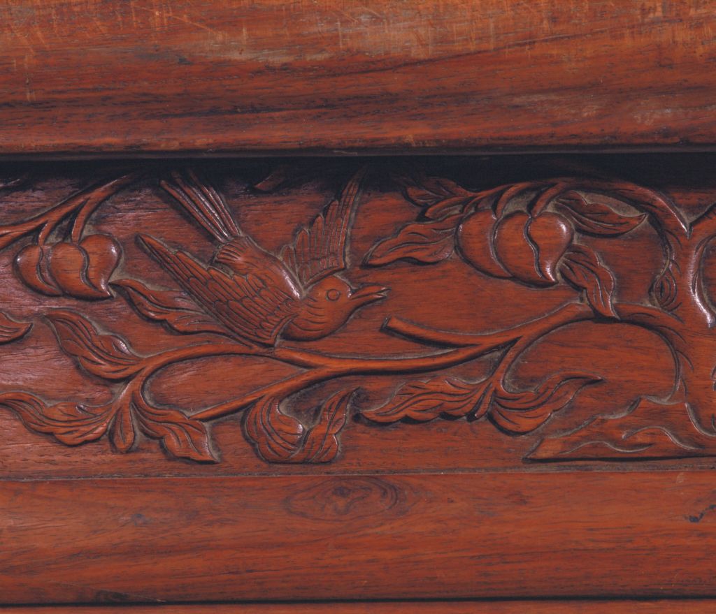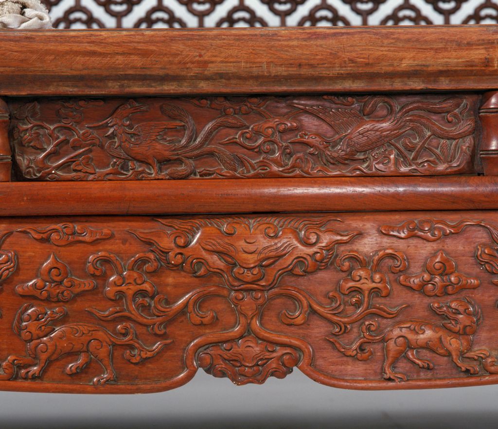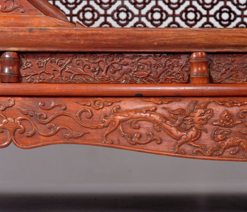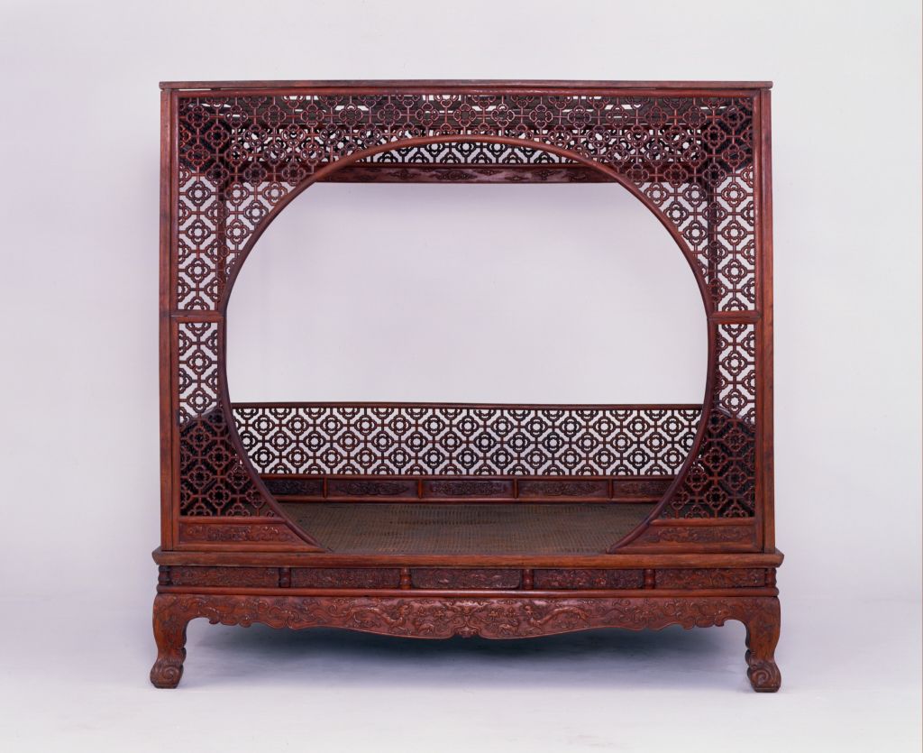 明,高227厘米,横247.5厘米,纵187.5厘米。 床由床屉、床围、立柱、月洞门、倒挂牙子及床顶等多件组成。各结合部位均用活榫,便于分解组合。床身正面装圆形门罩,连同背后及两侧床围,均为四簇云纹加十字形构件攒成透棂,具有“四合如意”的吉祥寓意。床面为棕屉,上附花眼藤席。床面下高束腰,周围用竹节形矮佬界出多格,格内镶板,并浮雕花鸟,图案无一相同。束腰下承托腮。四面牙板与腿足作成壶门形。牙子边缘起线,对称浮雕螭纹及卷草纹。四腿三弯式,云纹足。此床之雕饰十分精致。明清时期制作高档家具的木料品种之一。又称老花梨,黄檀属木类。我国海南岛有此树种,又名“海南檀”,现为国家一级保护植物。指四角立柱、上有顶架可以挂帐的床,在我国南方流行较广。一般指设置在桌案的面框或束腰下、连接于两腿之间的部件。设于其它部位的则常称牙条。束腰,明清家具部件名称。原是须弥座上枭与下枭之间的部分,在家具上指面框和牙条之间缩进的部。束腰是我国传统家具造型的典型式样之一。矮柱的俗称,常和横枨组合使用。在平面上雕出凸起的纹饰或物象的一种雕塑。按凸起高度的不同,可分为高浮雕、深浮雕、浅浮雕等,也有几种雕刻技法结合使用的形式,多见于高精繁杂的雕刻作品。 束腰与牙条之间的托层。有些束腰家具,束腰与牙条不衔接或衔接甚少,不能起到支撑作用,这时在两者之间加一木条过渡,使结构更加合理。家具部件名称。一般指面框或束腰下设置的连接于两腿之间的部件。设在其它部位的一般称为牙条。螭,传说中的一种龙,又名螭虎龙。明式家具常用为装饰纹样。 瓷器纹饰,又称卷叶纹或卷枝纹,宜于作各种器物的辅助纹饰。 17、18世纪传入中国的一种装饰花纹。俗称西蕃莲,如果没有花朵,则称为卷草。