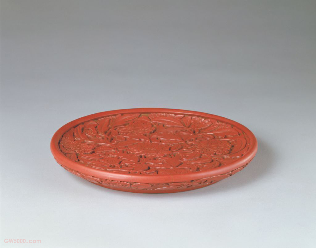 明早期这类花卉题材的作品多为黄漆素地,不刻锦纹,属《髹饰录》中“有无锦纹者,黄地似之”一类,这种处理方法是对元末张成、杨茂雕漆特征的继承。这种花卉题材的作品,通常以数朵盛开的大花为主,四周衬托含苞欲放的花蕾,这种构图风格为明永乐雕漆的显著特征。此盘漆质坚实,色泽纯正,雕工浑厚,磨工细腻圆润,为明代永乐时期果园厂雕漆的精品。雕漆品种之一,又名“雕红漆”或“红雕漆”。此技法成熟于宋元时期,发展于明清两代。明黄成《髹饰录·坤集·雕镂第十·剔红》中写道:“剔红,即雕红漆也。……宋元之制,藏锋清楚,隐起圆滑,纤细精致。”其法常以木灰、金属为胎,在胎骨上层层髹红漆,少则八九十层,多达一二百层,至相当的厚度,待半干时描上画稿,然后再雕刻花纹。一般以锦纹为地,花纹隐起,华美富丽。根据漆色的不同,有剔红、剔黄、剔绿、剔黑、剔彩、剔犀之分,其中以剔红器最多见。明早期果园厂漆器的一种雕饰做法,常见于花卉题材的作品中。即以黄漆为底色,不刻锦纹,素地上压朱漆花纹,与山水人物题材的雕漆作品刻锦纹地的做法完全不同。这种黄漆素地的效果极佳,一方面可以突出表面的花纹,另一方面可以使漆地平滑整齐。永乐十九年,明成祖朱棣迁都北京后,“御用监”便在皇城内设置了御用漆器作坊果园厂。元代雕漆名匠张成之子张德刚被召进京,“面试称旨,即授营缮所副” ,掌管果园厂漆器的生产。因此,明永乐、宣德时期,果园厂的雕漆保持了元代张成、杨茂雕漆“浑厚圆润,藏锋清晰,磨工大于雕工”的特点。果园厂遗址今不存,据文献记载,在西安门内,棂星门迤西,约为现在西什库之东的灵境胡同一带。