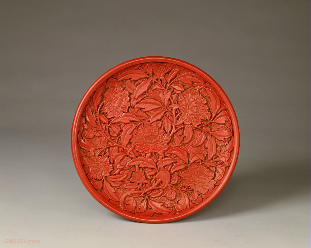 剔红双层牡丹纹圆盘,高4.5厘米,口径32.2厘米。