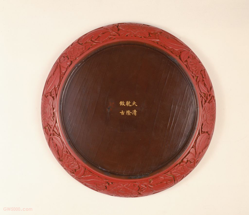 此盘黄漆素地,盘内雕双层重叠的牡丹,穿枝过梗,各自成章,或露或藏,繁而不乱,充分表现出明永乐时期果园厂雕漆的高超技法。足内“大明永乐年制”针刻6字为原款,正中的楷书填金“大清乾隆仿古”款为后刻。