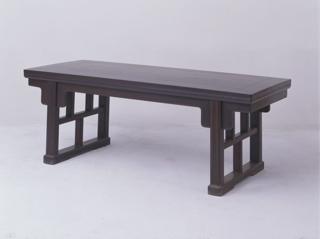 高85厘米,宽233厘米,纵93厘米。 通体以紫檀木制成,案面光素,面下为素牙板,四腿混面双边线,两侧腿间安委角方格枨,下有托泥。 此案的特点是用重材,显得格外浑厚凝重,边抹宽度达15.8厘米,厚6.5厘米,紫檀家具用如此大料实属罕见。此案造型方正,工艺精致,装饰简洁,是一件典型的明代家具。紫檀木是世界上最名贵的木材之一,主要产于南北回归线之间的热带、亚热带地区,我国广东、云南等地有少量出产。其木质坚硬,体重,入水即沉,没有疤痕,呈紫黑色。紫檀木生长缓慢,非数百年不能成材,故极珍贵。紫檀木的纹理纤细浮动,变化无穷,其色调深沉,显得稳重、大方、美观。《博物要览》称:“新者色红,旧者色紫,有蟹爪纹,新者以水浸之,可染物。”我国古代使用紫檀木制作器物历史悠久,东汉末年已见于记载,唐代宫廷中亦有使用紫檀木的记载。至明代,紫檀木更是受到皇家的宠爱。清代,紫檀木大量进入宫廷中,为内务府造办处用于制作清宫家具及文玩之器的必备材料,同时一些富商大贾之家也多使用名贵的紫檀木制造家具及生活用品。 家具部件名称。一般指面框或束腰下设置的连接于两腿之间的部件。设在其它部位的一般称为牙条。家具中线角术语。一般的桌面、几面、案面均为直角,将四个直角改为小斜边而成八角形的做法,北方木工称为“委角”,江南木工称“劈料做”。传统家具上承接腿足的部件。明清家具中有的腿足不直接着地,另有横木或木框在下承托,此木框即称为“托泥”。有的托泥之下还有小足,小足才是真正落地的部位。此部件多见于条案、几类等传统家具,以增稳重之感。明清时期制作高档家具的木料品种之一。又称老花梨,黄檀属木类。我国海南岛有此树种,又名“海南檀”,现为国家一级保护植物。案面平直的案称作“平头案”。明式家具中平头案的式样较多,也较讲究。
