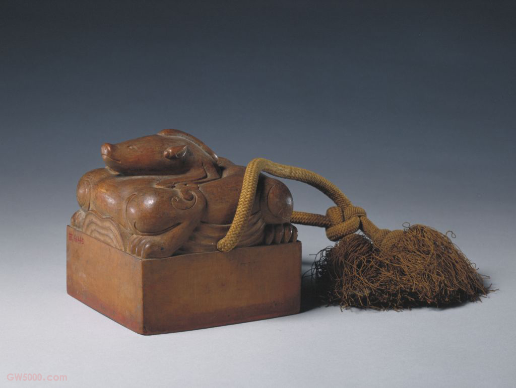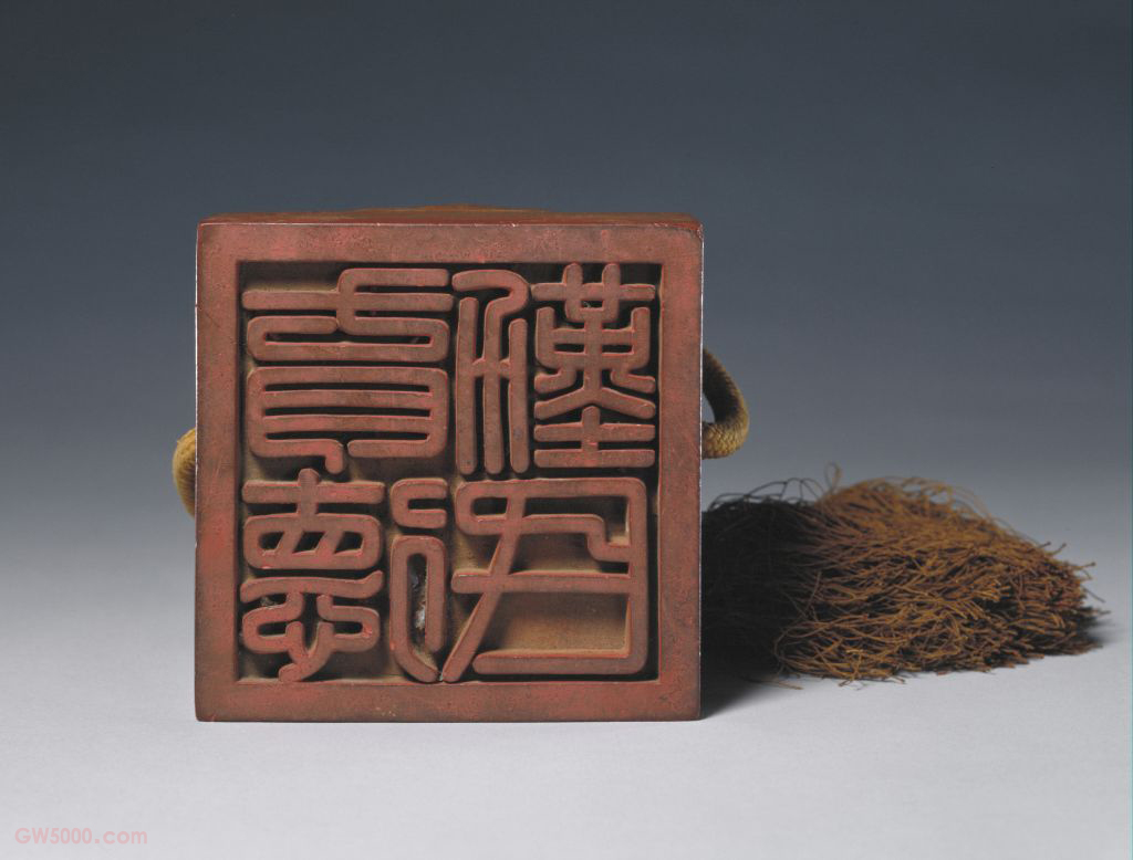 “育德勤民”玺,清康熙,檀香木质,瑞兽纽方形玺,汉文篆书。面11厘米见方,通高10.8厘米,纽高6.2厘米。附系黄色绶带。 “育德勤民”语源《易经》:“山下有风,蠱君子以振民育德。”盖言君子自当外振穷民,内育己徳,以成天下之大治,强调涵养道德在施政临民中的重要性。康熙此宝稍作变通,改“振民”为“勤民”,凸现出其勤政爱民的“民本”思想。