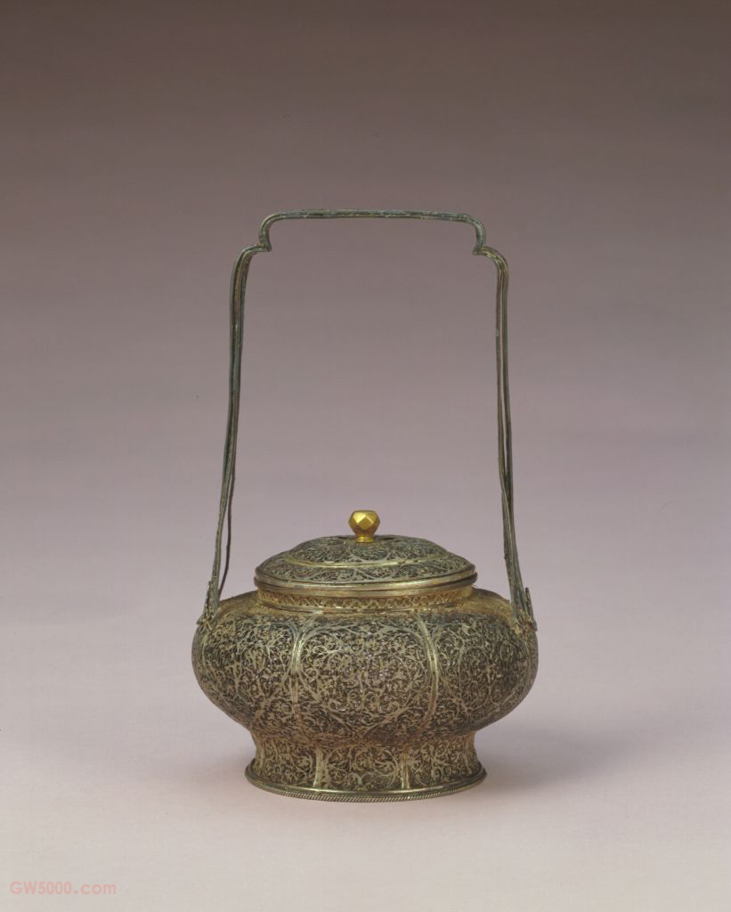 银鎏金累丝提梁花篮,清,通梁高19.5 厘米,口径7.7 厘米,足径8.4厘米。 花篮短颈,丰肩膀,腹下收敛,竖长平框式提梁,带纯金骨朵式钮盖。篮身由八瓣相同装饰的曲面焊接而成,每个曲面以对称的桃形纹饰为主,期间细丝卷曲盘桓,勾勒出规律而又富于变化的几何纹样。 我国古代金工传统工艺之一,又名“花作”或“花纹”,为金属工艺中最精巧者。它是将金银拉成丝,然后将其编成辫股或各种网状组织,再焊接于器物之上,谓之累丝。立体的累丝作品制作最难,须事先经“堆灰”的手续。所谓“堆灰”,即把炭研成细末,用白芨草泡制的粘液调和作为塑料,塑成人物或走兽等所要制作的物象,然后再在上面进行累丝,用焊药焊连,之后置于火中把里面的炭模烧毁,即成立体中空剔透玲珑的精美艺术品。