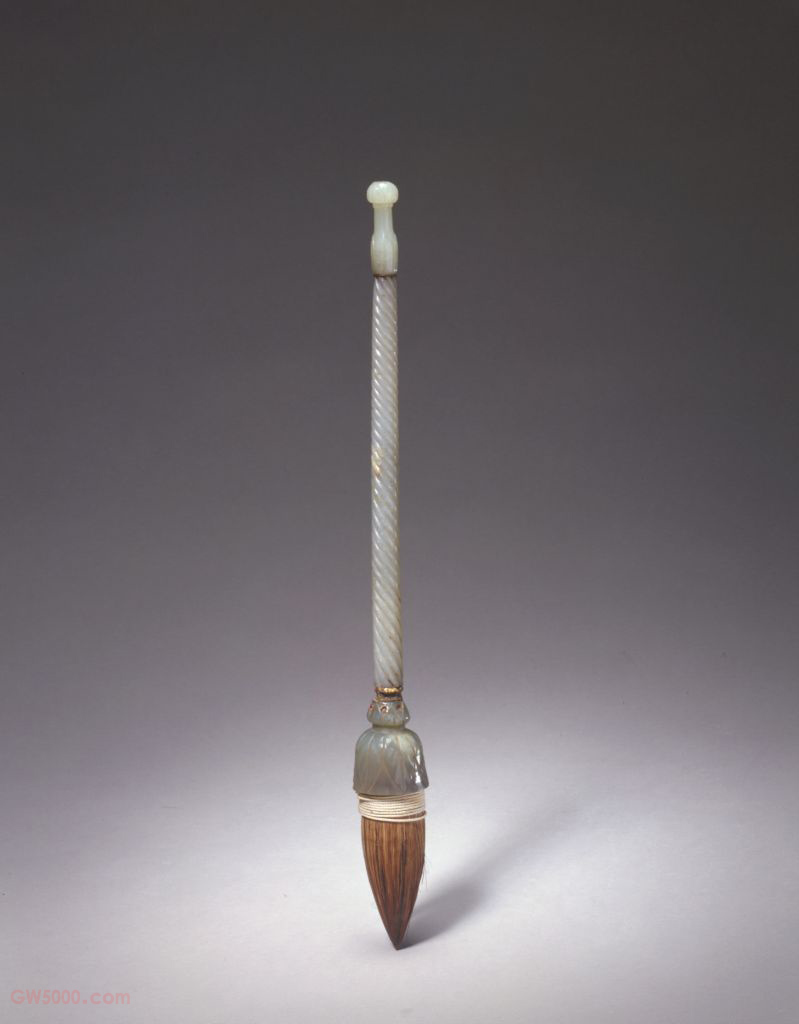 此笔管乃清宫旧藏仿痕都斯坦玉雕风格的作品,是清代毛笔艺苑中吸取外来文化的典型之作。