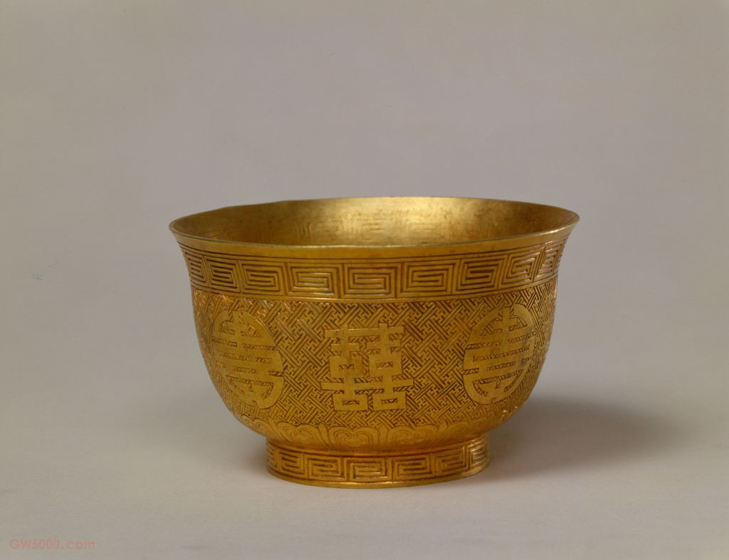 金錾双喜团寿字茶碗,清同治,高5.9 厘米,口径9.7 厘米,足径5.2厘米。我国古代金工传统工艺之一。用小锤敲击各种大小不同的金属錾子,在金属表面留下錾痕,形成各种不同的纹理,使单一的金属表面产生多层次的立体装饰效果。此种工艺始于春秋晚期,盛行于战国,至今依然为匠师们沿用。