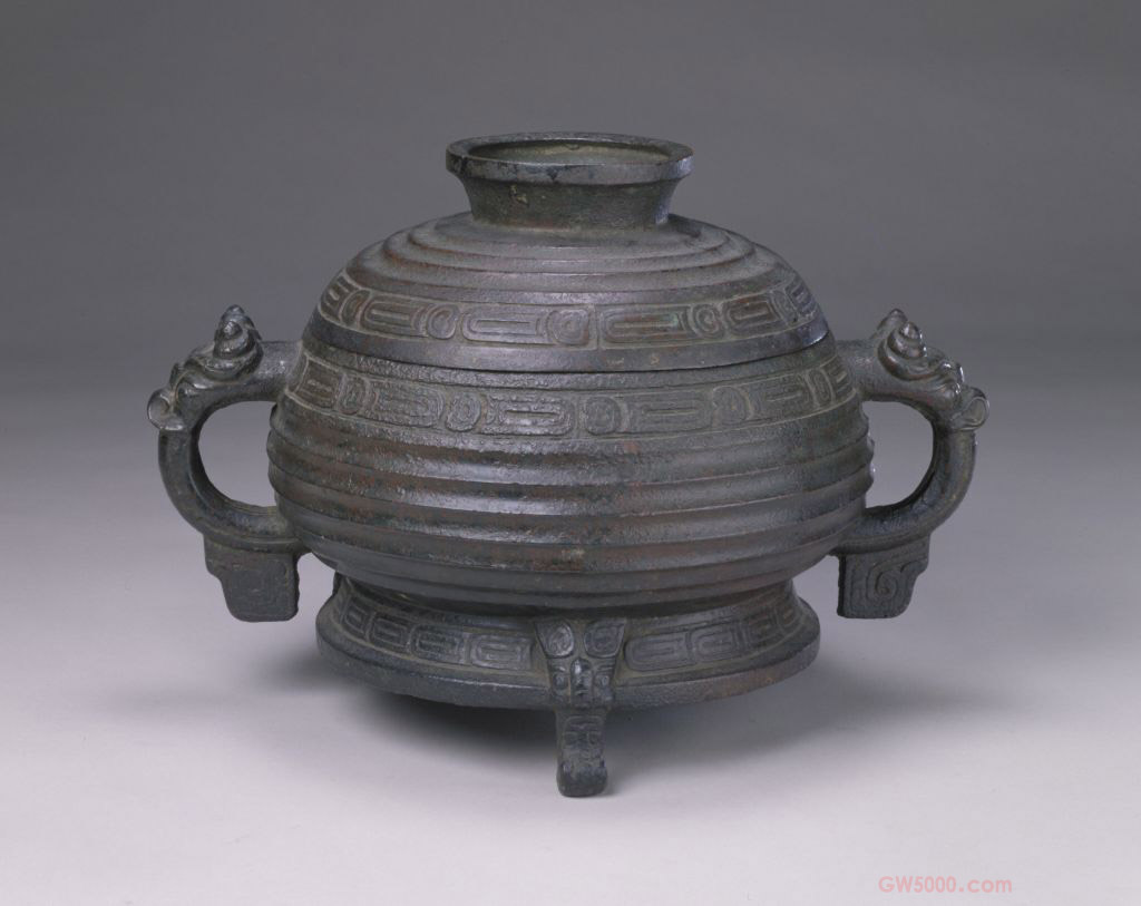 簋圆形,敛口,鼓腹,有双耳,耳上端雕铸兽头,兽角呈螺旋状,圈足,圈足下为三兽形扁足。有盖,盖上有圆形捉手。盖顶与器腹饰瓦纹,盖沿、颈部和圈足上饰重环纹。