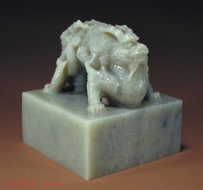 “制诰之宝”,清早期,青玉质,交龙纽方形玺,汉文篆书满文篆书。面13厘米见方,通高14.7厘米,纽高8.5厘米。 乾隆帝钦定二十五宝之一,据《交泰殿宝谱》,用此宝“以谕臣僚”,但实际上多是在册书或诰命上钤用。按清朝定制,覃恩封赠五品以上官员及世爵承袭罔替者则颁发诰命,诰命因发放的对象不同名称也不同,官员本身受封称为“诰授”,封其曾祖父母、祖父母、父母及妻,生者称“诰封”,死者称“诰赠”。但不管是“诰授”,还是“诰封”、“诰赠”,都要钤盖“制诰之宝”。据《大清会典》记载:“凡给功臣世袭罔替诰命,分别世次敕书,由该衙门开载功绩,移送内阁,交中书科缮写,送阁用宝,仍行该衙门给发。其子孙承袭时,令该衙门将原给诰敕送阁,中书科填写承袭人名年月,仍送阁用宝。”这里所用之宝,绝大多数是这方“制诰之宝”,此宝是二十五宝中使用较多的一方。制诰之宝,通高14.7cm,印面13×13cm。青玉质,交龙纽。据《交泰殿宝谱》,此宝作“以谕臣僚”之用。
