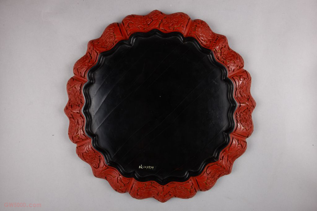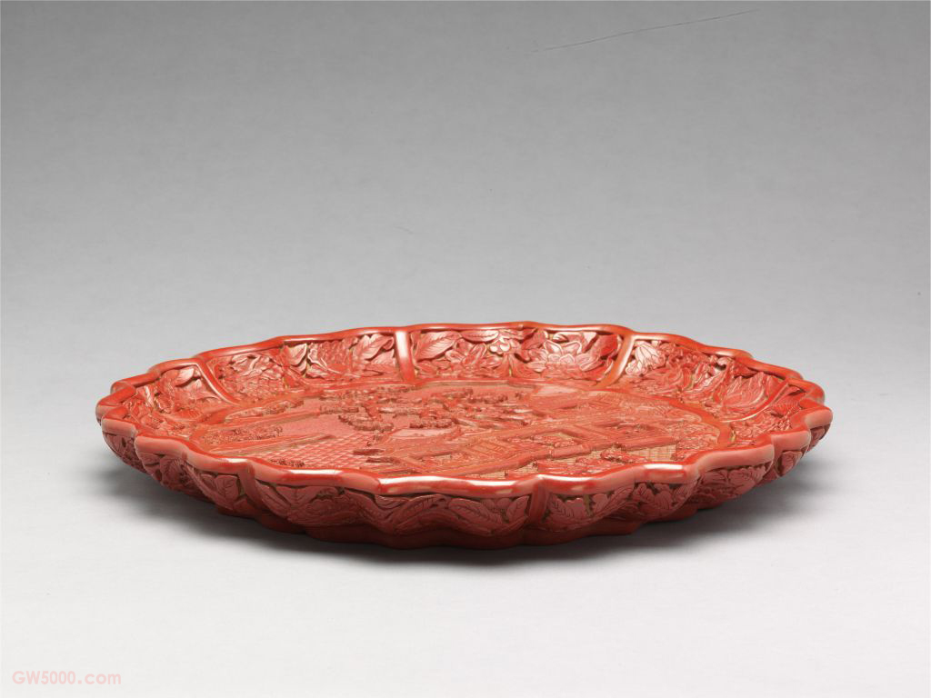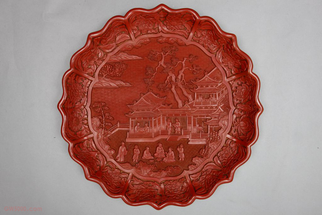 剔红宴饮图菱花式盘,明永乐,高4厘米,口径34.8厘米,足径26.6厘米。清宫旧藏。 盘八瓣菱花式,随形圈足。通体雕红漆。盘心随形开光,内雕亭台以及众人宴饮欢聚的情景。盘内壁菱花形瓣内雕俯仰的石榴花、茶花、牡丹以及荷、菊等花卉纹,外壁装饰几近相同。外底为后髹黑漆。 该盘所雕人物较多,或坐楼阁内晤谈,或坐庭院中对饮,气氛欢愉。雕漆品种之一,又名“雕红漆”或“红雕漆”。此技法成熟于宋元时期,发展于明清两代。明黄成《髹饰录·坤集·雕镂第十·剔红》中写道:“剔红,即雕红漆也。……宋元之制,藏锋清楚,隐起圆滑,纤细精致。”其法常以木灰、金属为胎,在胎骨上层层髹红漆,少则八九十层,多达一二百层,至相当的厚度,待半干时描上画稿,然后再雕刻花纹。一般以锦纹为地,花纹隐起,华美富丽。根据漆色的不同,有剔红、剔黄、剔绿、剔黑、剔彩、剔犀之分,其中以剔红器最多见。 我国传统装饰技法之一。即为使器物上的装饰变化多样或突出某一形象,往往在器物的某一部位勾勒出某一形状(如扇形、蕉叶形、菱形、心形、桃形、圆形等)的空间,其内饰以图纹。