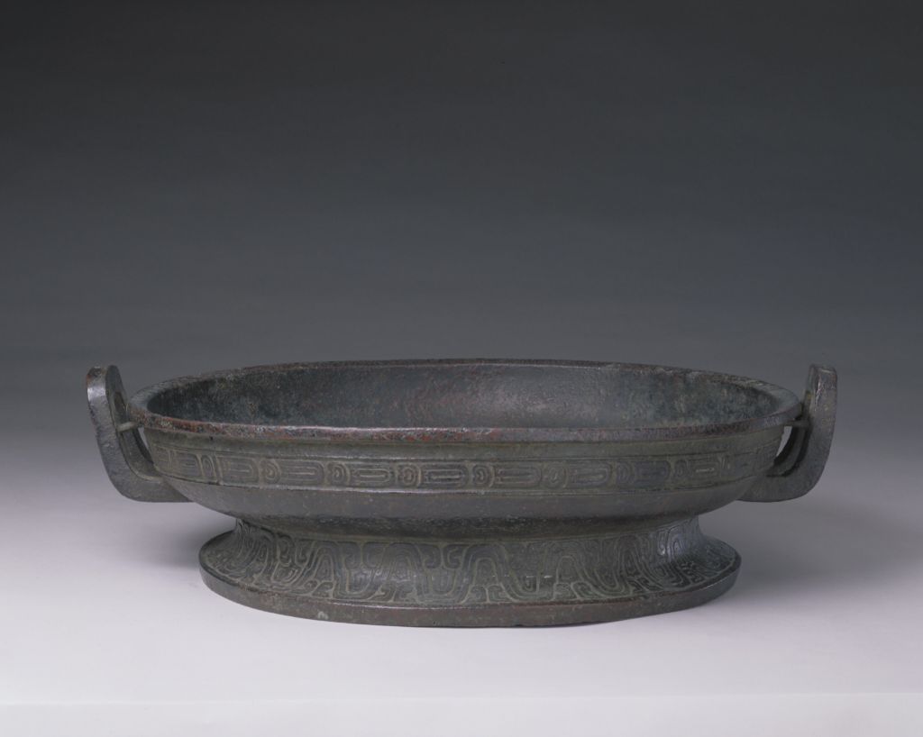 青铜器中的盘一般为承水器,多与匜、盉配合使用。其用法据《礼记·内则》载:“进盥,少者奉槃(盘),长者奉水,请沃盥,盥卒授巾。”沃盥,即洗手,以匜或盉浇水于手,盘则用来承接弃水,宴飨前后行之,也称“沃盥之礼”。此盘形体颇大,也可作盛水之用。青铜器中的盘最早出现于商代早期,战国时逐渐消失。