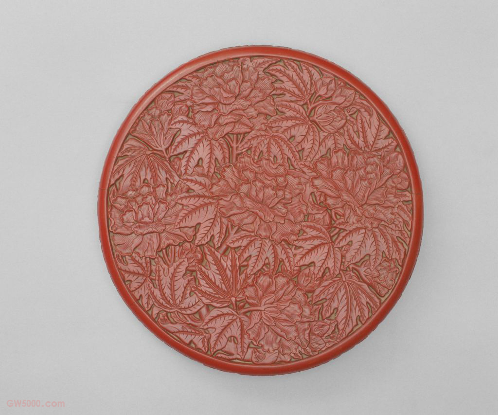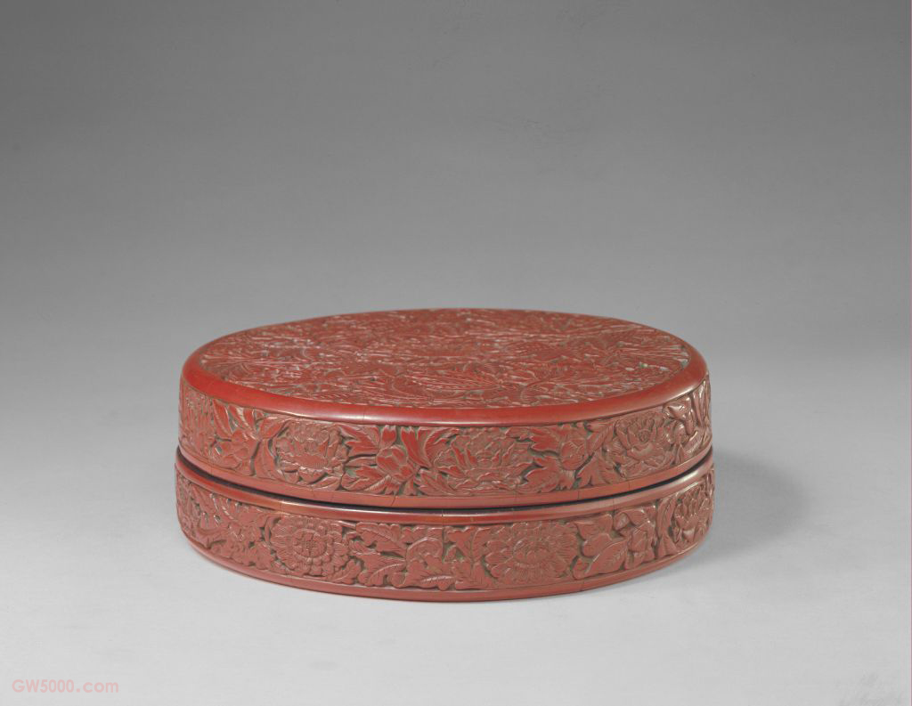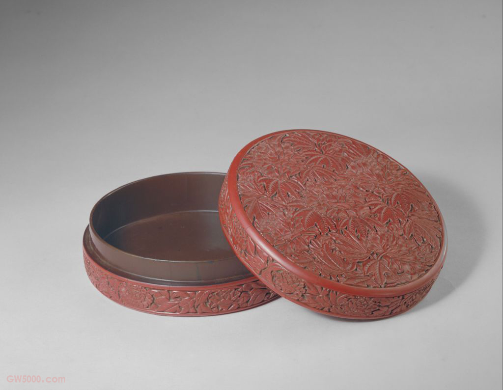 剔红芙蓉花纹圆盒,明永乐,高7.3厘米,口径21厘米。清宫旧藏。