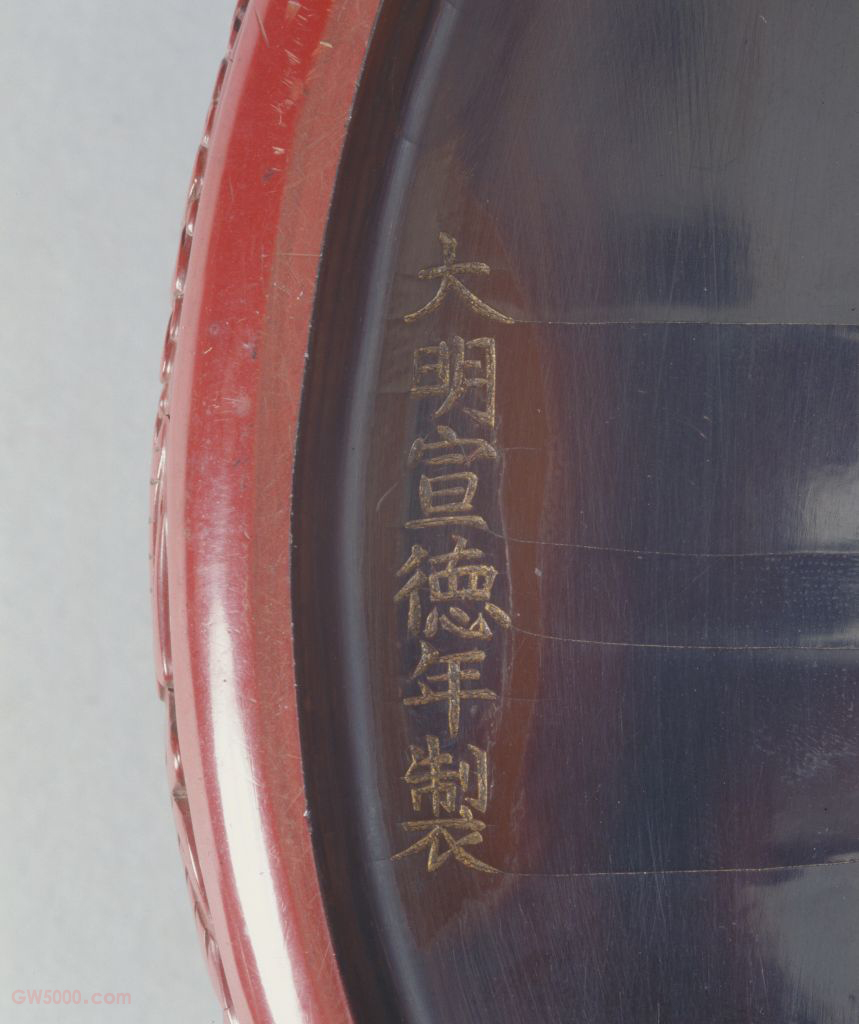 盒蔗段式,直壁,平底。盒面满雕盛开的芙蓉花,边壁环雕牡丹、菊花、茶花、芙蓉、石榴等花卉。外底为后髹黑漆,左侧近足处有刀刻填金“大明宣德年制”楷书款,款下有长条涂抹痕迹,应为“大明永乐年制”款。