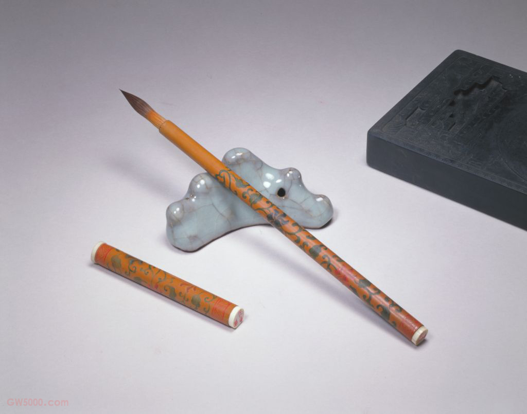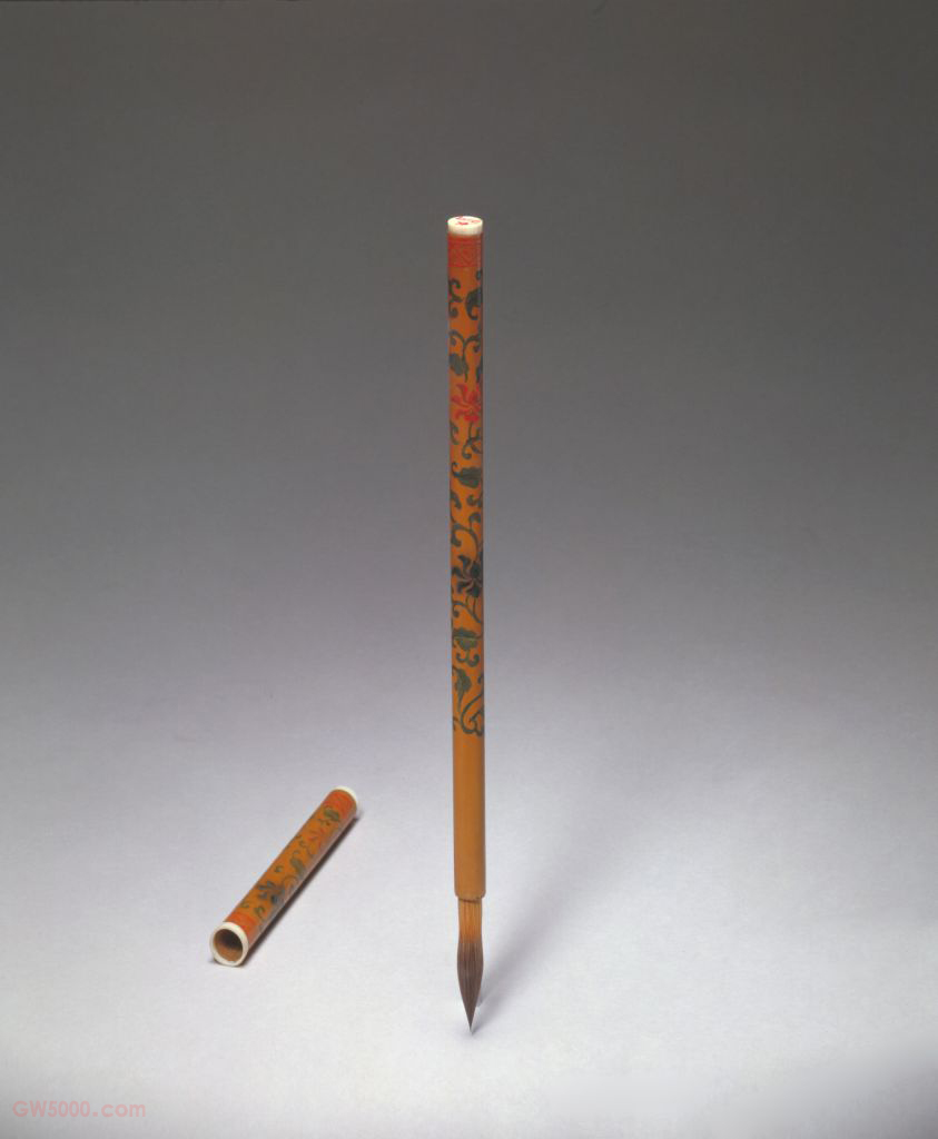 笔头紫毫制,呈兰蕊形,根部装饰浅黄色毫毛,是清代流行的毛笔式样。笔管、笔帽均为竹胎漆艺,黄色漆地上以朱、绿彩绘缠枝莲,莲纹漫卷,疏朗有致。笔管末端及笔帽两端描朱几何图案。笔顶、帽口镶饰象牙。