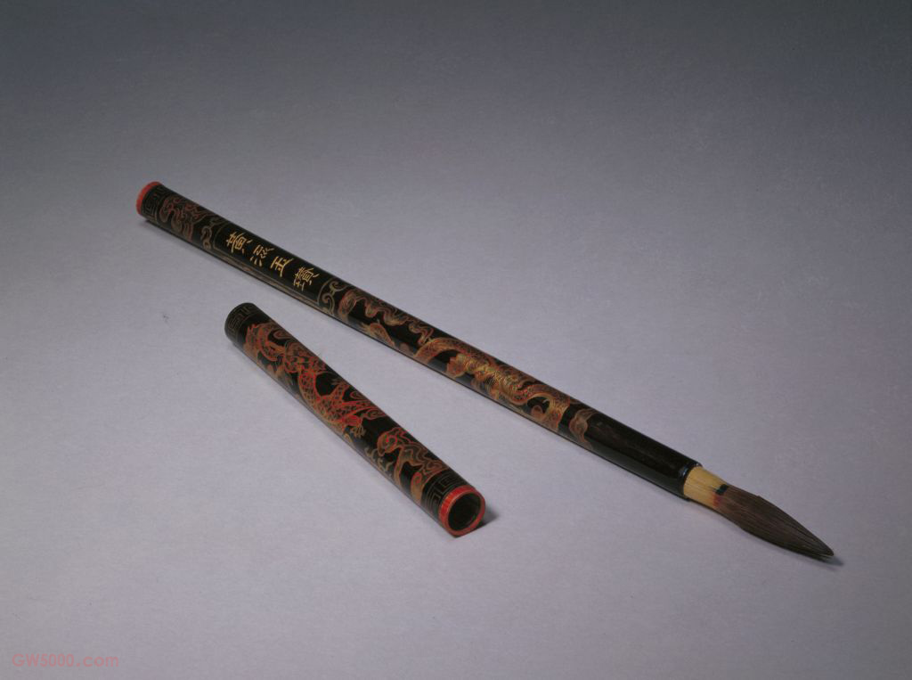 笔头紫毫制,形似兰蕊,根部饰黄色毫毛。笔管、笔帽均为竹胎髹漆,黑漆地上描朱绘云龙纹,笔管末端及笔帽两端分别描金回纹一周。管上端刻阴文隶书题“黄流玉瓒”四字,出自《诗·大雅·文王之什》中的“旱麓”诗:“瑟彼玉瓒,黄流在中。”诗赞周文王能承祖业,修德政,恭敬祭祀而得福气