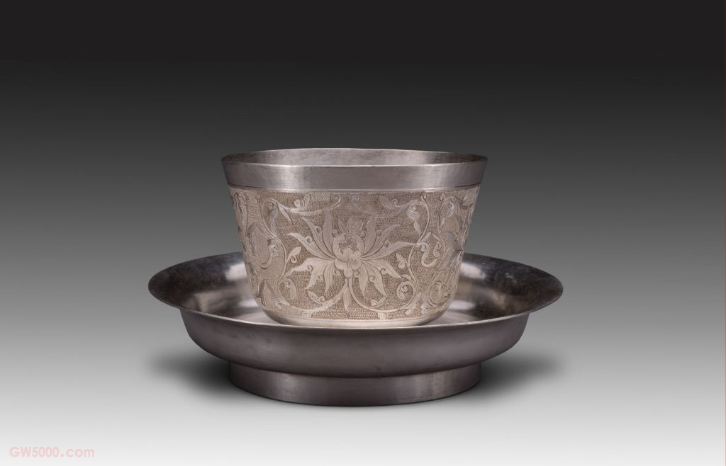 银簪花缠枝西番莲纹杯,清,通高6.7 厘米,杯高5.9 厘米,口径8 厘米,足径3.9 厘米,盘高3 厘米,口径12.8 厘米,足径7.8厘米。 银杯直口,斜直壁。外壁以珍珠纹底,錾刻缠枝西番莲纹,每朵花卉皆由其卷须茎叶从左右两侧环绕,形成开光。 银杯配备内外壁光素的银盘一盏。