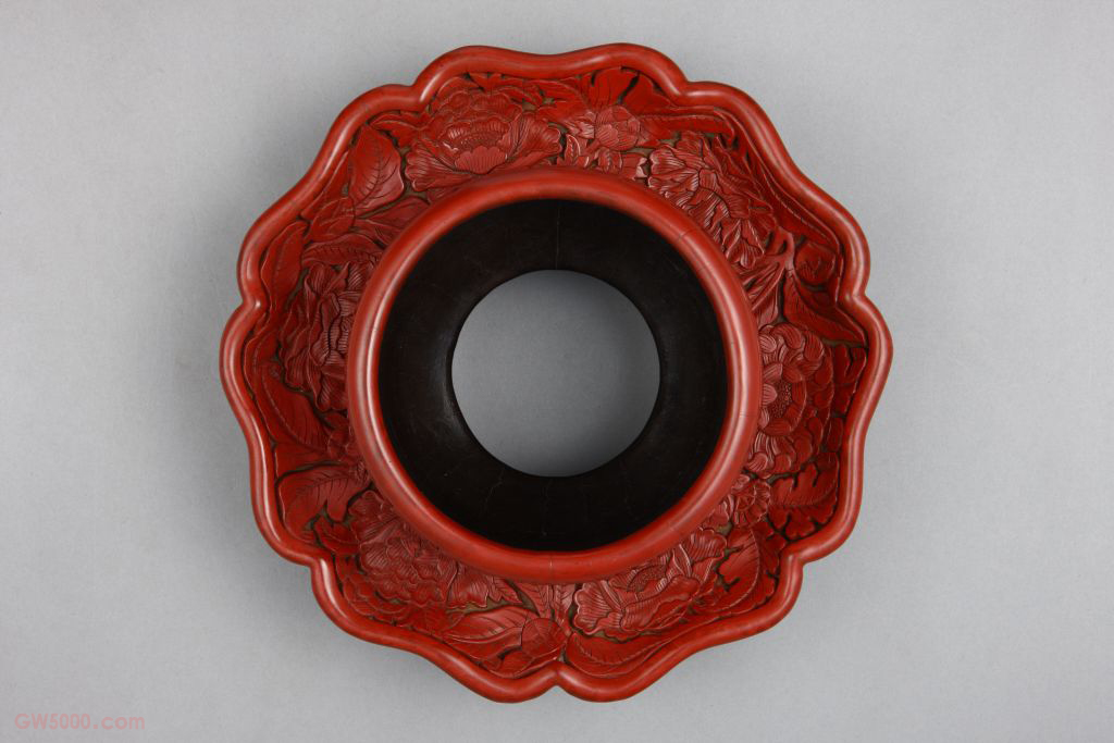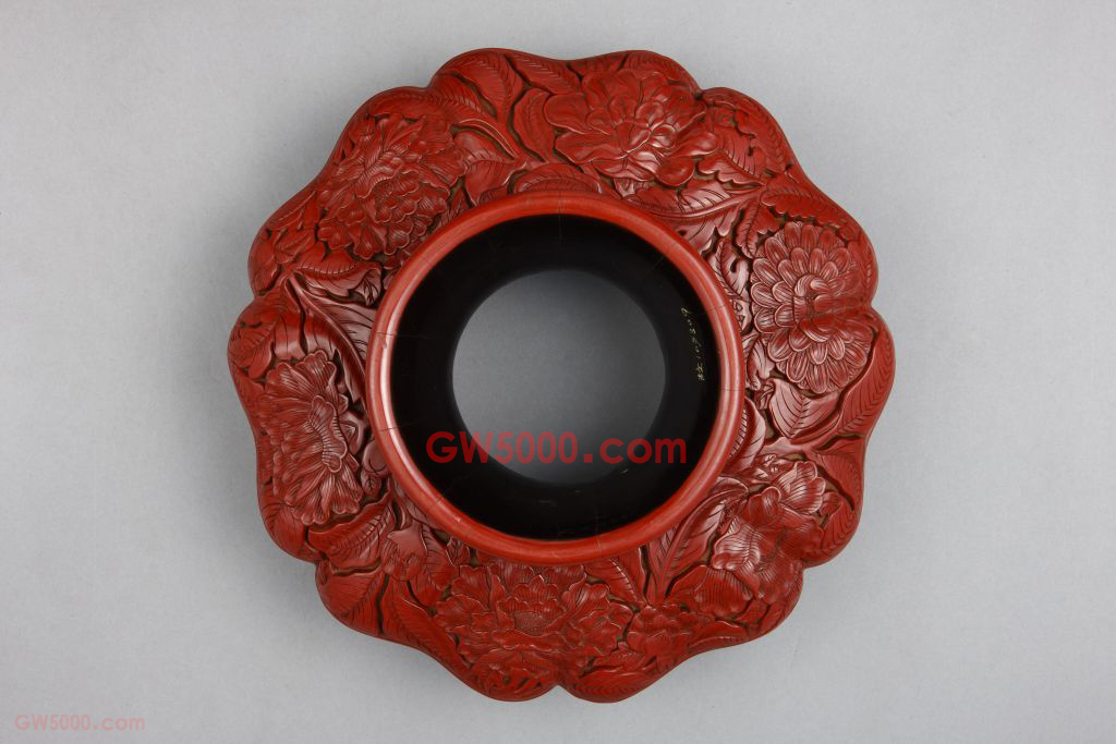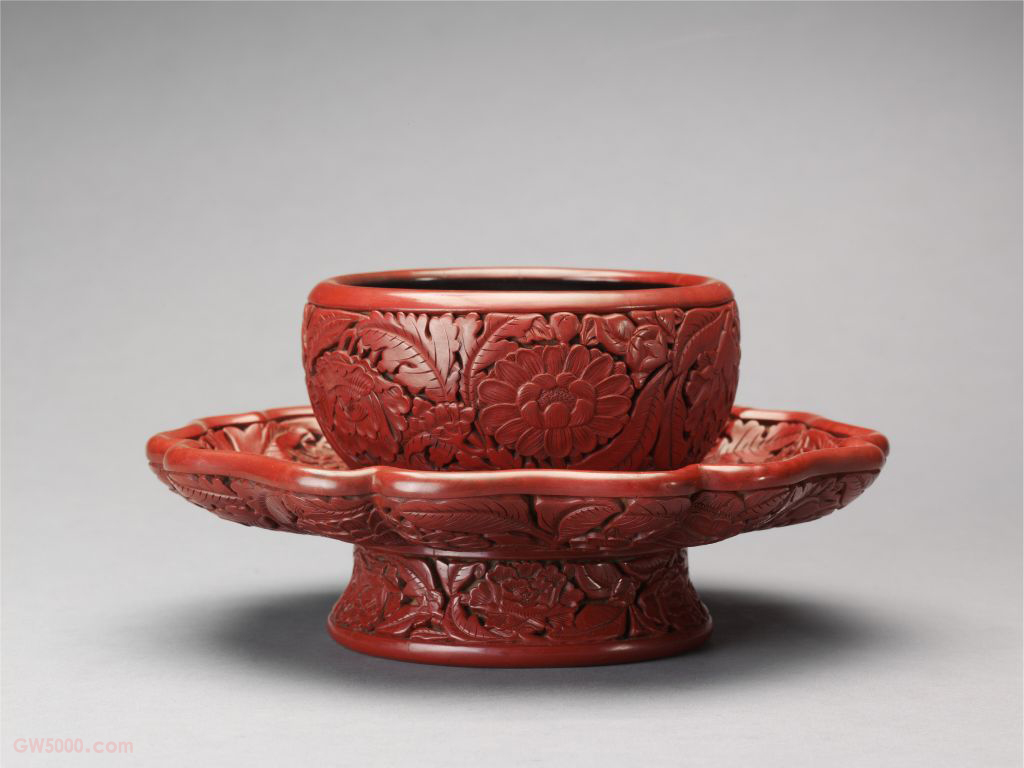 剔红花卉纹盏托,明永乐,高10厘米,口径12厘米,盘径21厘米,足径11.4厘米。清宫旧藏。 盏托由圆形盏、葵瓣形盘和外撇圈足三部分组成,承继宋代盏托而在比例上略有变化。通体在黄漆素地上雕红漆花纹。盏、盘、足均环雕俯仰相间的花卉6朵,有牡丹、菊花、石榴、栀子、茶花。托内至足为空心,髹赭色漆,足内右侧针划“大明永乐年制”行书款。 盏托由上至下可分三部分,四个装饰面每面的花卉纹饰的排列皆不相同。雕漆品种之一,又名“雕红漆”或“红雕漆”。此技法成熟于宋元时期,发展于明清两代。明黄成《髹饰录·坤集·雕镂第十·剔红》中写道:“剔红,即雕红漆也。……宋元之制,藏锋清楚,隐起圆滑,纤细精致。”其法常以木灰、金属为胎,在胎骨上层层髹红漆,少则八九十层,多达一二百层,至相当的厚度,待半干时描上画稿,然后再雕刻花纹。一般以锦纹为地,花纹隐起,华美富丽。根据漆色的不同,有剔红、剔黄、剔绿、剔黑、剔彩、剔犀之分,其中以剔红器最多见。 古建筑彩画绘画的一种题材。清代中期之前多画绿叶子花卉,清代晚期画黑叶子花卉。放置茶盏的承托物,是与盏配套使用的一种茶具,在宋代较为流行。瓷质盏托始见于东晋,宋代汝窑、定窑、钧窑、景德镇窑等窑均有烧制。托口沿除圆形还有花瓣形。明早期果园厂漆器的一种雕饰做法,常见于花卉题材的作品中。即以黄漆为底色,不刻锦纹,素地上压朱漆花纹,与山水人物题材的雕漆作品刻锦纹地的做法完全不同。这种黄漆素地的效果极佳,一方面可以突出表面的花纹,另一方面可以使漆地平滑整齐。