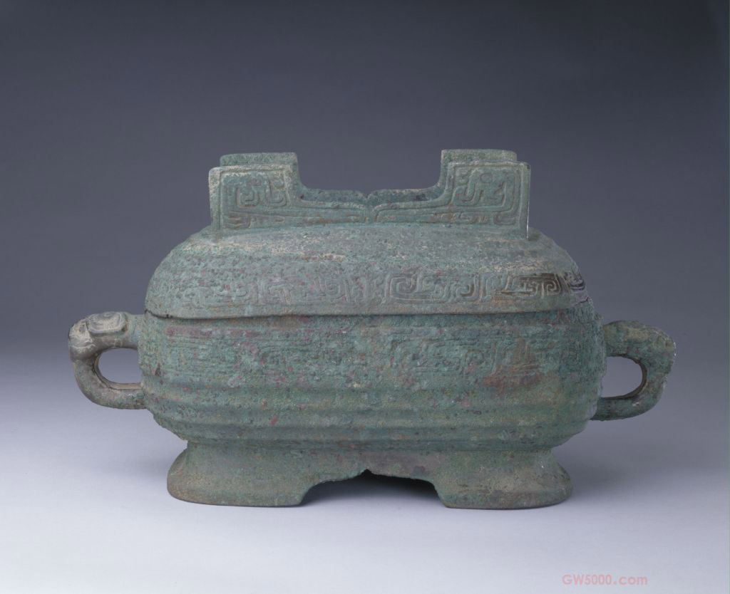 盨长方形,敛口,圆角,双兽耳,圈足。有盖,盖上有4个呈矩形的短足。盖沿与器颈各饰窃曲纹一道,盖上与器腹饰瓦棱纹,盖之矩足上饰夔纹。