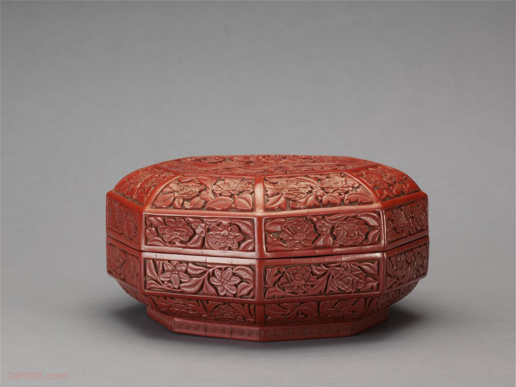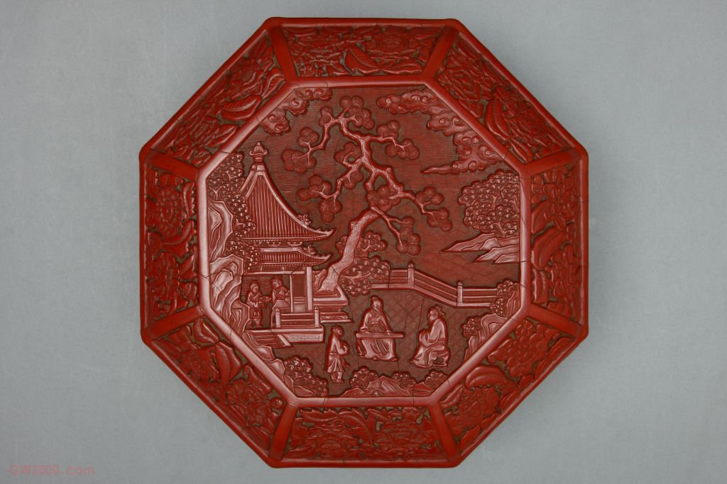 此盒盖上的抚琴图似表现俞伯牙和钟子期高山流水的典故。永乐时期的雕漆盒以蔗段式、蒸饼式为多,八方形者罕见。该盒造型规整端庄,漆质温润,雕刻圆熟,为传世佳作。雕漆品种之一,又名“雕红漆”或“红雕漆”。此技法成熟于宋元时期,发展于明清两代。明黄成《髹饰录·坤集·雕镂第十·剔红》中写道:“剔红,即雕红漆也。……宋元之制,藏锋清楚,隐起圆滑,纤细精致。”其法常以木灰、金属为胎,在胎骨上层层髹红漆,少则八九十层,多达一二百层,至相当的厚度,待半干时描上画稿,然后再雕刻花纹。一般以锦纹为地,花纹隐起,华美富丽。根据漆色的不同,有剔红、剔黄、剔绿、剔黑、剔彩、剔犀之分,其中以剔红器最多见。明早期果园厂漆器的一种雕饰做法,常见于花卉题材的作品中。即以黄漆为底色,不刻锦纹,素地上压朱漆花纹,与山水人物题材的雕漆作品刻锦纹地的做法完全不同。这种黄漆素地的效果极佳,一方面可以突出表面的花纹,另一方面可以使漆地平滑整齐。 古建筑彩画绘画的一种题材。清代中期之前多画绿叶子花卉,清代晚期画黑叶子花卉。家具上常用的纹饰之一,由陶器和青铜器上的雷纹衍化而来,寓意吉利深长,苏州民间称之为“富贵不断头”。在家具上,回纹主要作为边饰,用于边框、牙条、足端或束腰等处。家具上大量采用回纹见于清代。 春秋时期,俞伯牙善于鼓琴,钟子期深谙琴趣,伯牙琴曲,志在高山,志在流水,子期听后遂用“高山流水”比喻知音。