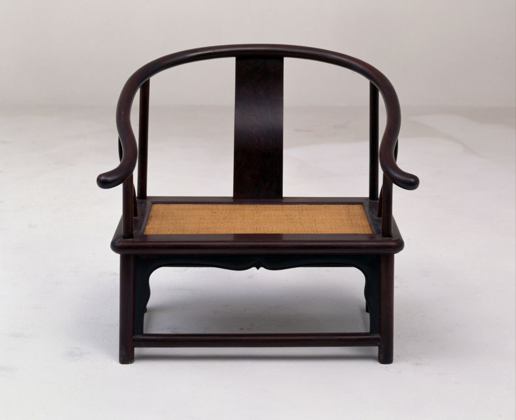 紫檀藤心矮圈椅,明,高58厘米,横59厘米,纵37厘米。清宫旧藏。 此椅紫檀木制,简洁无饰,椅圈光素,圆润柔婉,自搭脑向扶手一顺而下,扶手尽端外撇,形似鳝鱼头,这是明式家具的典型造型,镰刀把式联帮棍,藤心座面。靠背椅用弧形弯材制作,呈S形曲线,座盘下三面饰壸门券口,壸门边缘起阳线,圆腿直足无束腰。 此种腿足高度矮于靠背的圈椅所存极少,其功能或为富贵人家的儿童使用,或置于轿中使用,又称轿椅,是明式家具中较别致的一类。紫檀木是世界上最名贵的木材之一,主要产于南北回归线之间的热带、亚热带地区,我国广东、云南等地有少量出产。其木质坚硬,体重,入水即沉,没有疤痕,呈紫黑色。紫檀木生长缓慢,非数百年不能成材,故极珍贵。紫檀木的纹理纤细浮动,变化无穷,其色调深沉,显得稳重、大方、美观。《博物要览》称:“新者色红,旧者色紫,有蟹爪纹,新者以水浸之,可染物。”我国古代使用紫檀木制作器物历史悠久,东汉末年已见于记载,唐代宫廷中亦有使用紫檀木的记载。至明代,紫檀木更是受到皇家的宠爱。清代,紫檀木大量进入宫廷中,为内务府造办处用于制作清宫家具及文玩之器的必备材料,同时一些富商大贾之家也多使用名贵的紫檀木制造家具及生活用品。 亦称欹床。中国传统家具中的一种坐具,现已很少见。其形式犹如椅子的靠背,是一种无座腿甚至无座面的坐具。其背后安有可以撑放的活动支架,可根据使用者的要求调节靠背的角度。它多在床榻上或席地使用。明高濂《遵生八笺》中说:“靠背以杂木为框,中穿细藤,如镜架然。高可二尺,阔一尺八寸,下作机扃,以准高低,置之榻上,坐起靠背,偃仰适情,甚可人意。”宋、明绘画中也可见到此种坐具。明式官帽椅(扶手椅)扶手下装饰的曲弯构件,下粗上细,亦称“耗子尾巴”。将三根板条安装在方形或长方形的框格中,形似拱券状,故名。宫内小巷道称壸(音捆),此处为家具术语之一。通常在横牙正中开一尖口,再向两侧曲线延伸与竖向牙条相交,此种作法称为劵口;如果牙条四面相交,则每面正中均开尖口,此种作法称为圈口;如果只有一面横牙条作出壸门装饰,则称为壸门牙子。家具中面与腿直接结合的形制称为“无束腰”。束腰,明清家具部件名称。原是须弥座上枭与下枭之间的部分,在家具上指面框和牙条之间缩进的部。束腰是我国传统家具造型的典型式样之一。妃嫔的称号。东汉时始置,仅次于皇后。清朝沿用此名,但位次在皇后、皇贵妃、贵妃、妃、嫔之后,品位较低。