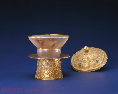 玛瑙镶金口带托盖葵瓣碗,清,通高19.5 厘米,碗口径13.1 厘米,托径13.8 厘米,足径9厘米。