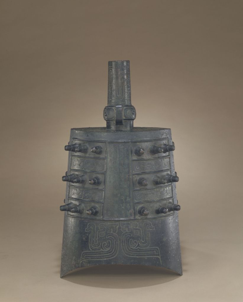 此钟体呈合瓦形,桥形口,长乳,甬饰环带纹。