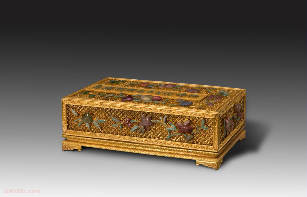 金镂花嵌玉石长方盒,清,高6 厘米,长18.2 厘米,宽10.7厘米。宝石名。据传源于波斯语“披及札基”的谐音,所以古时又称披耶西、碧霞玺、碧霞玭、碧霞希及碧洗等,即今日的“电气石”宝石。古籍记载碧玺产于缅甸,现我国新疆、内蒙古等地的伟晶岩中均产有各色碧玺,其中以新疆阿勒泰所产碧玺最为著名。