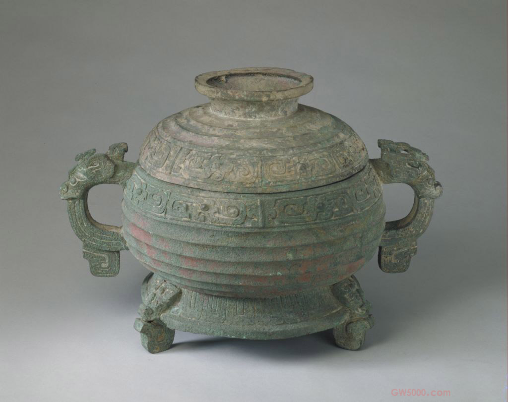 此簋圆鼓腹,二兽耳,弇口,圈足下有三兽首足。器有盖,盖顶为圆形捉手。盖面与器腹均饰平行瓦棱纹,盖沿及器颈各饰窃曲纹带。