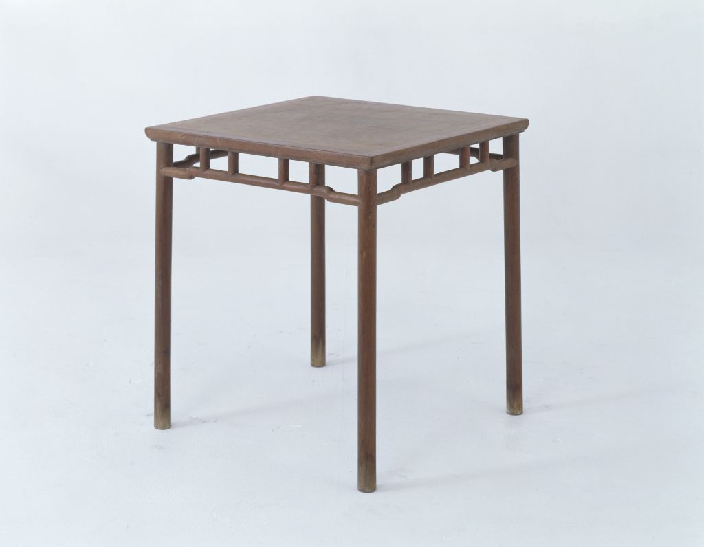 黄花梨方桌,明,高82.5厘米,边长75厘米。 方桌桌面平直方正,冰盘沿线脚,桌面之下四腿直接桌面,四腿上端安罗锅枨,枨上各施两组双矮佬。四腿及枨子均用圆材。方桌造型简练舒展,具有浓厚的明代家具特点。 据档案记载,此桌曾在寿安宫陈设和使用。明清时期制作高档家具的木料品种之一。又称老花梨,黄檀属木类。我国海南岛有此树种,又名“海南檀”,现为国家一级保护植物。桌面侧沿常见的线角装饰,从侧面看通常为圆弧形边下出短直线边。古代家具中凡两端低中间高,形如罗锅的枨子皆可称为“罗锅枨”。中国古代家具术语。桌面与罗锅枨间连接的短小立柱称矮佬,两个立柱成组使用称为“双矮佬”。矮柱的俗称,常和横枨组合使用。用于固定四腿的连接构件。一般指断面为圆形的木料。主要构件断面为圆形的家具常称以圆材制作。