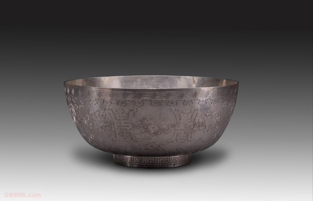 银錾“卍”寿纹碗,清,高8 厘米,口径17.8 厘米,足径8厘米。 碗直口,弧腹。内壁光素,外壁錾刻长“寿”字,并以缎带“卍”字纹相连,下腹近足处錾刻海水江崖纹,寓意“万寿无疆”。碗口、碗足以回纹为装饰。 金属工艺的一种。即用工具剔除地纹,使纹饰轮廓线凸起。錾金工艺技法早在商代就已出现,到清代,被广泛地运用于各种金属工艺品上。典出《诗经·豳风·七月》:“称彼兕觥,万寿无疆!”意为在朝堂上捧举起大酒杯,祝国君万年长寿无尽。家具上常用的纹饰之一,由陶器和青铜器上的雷纹衍化而来,寓意吉利深长,苏州民间称之为“富贵不断头”。在家具上,回纹主要作为边饰,用于边框、牙条、足端或束腰等处。家具上大量采用回纹见于清代。