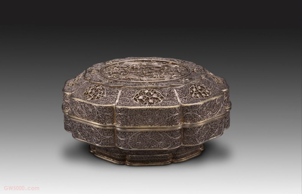 银累丝葵瓣式盒,清,高7 厘米,口径14 厘米,底径9.9厘米。 盒为八瓣葵瓣式,通体累丝拼接而成,盖顶圆形装饰凸起双龙戏珠纹,四周装饰八吉祥纹,再外围葵瓣则以开光花卉为装饰。盒盖、合身形状、累丝底纹皆成对称,严丝合缝,可谓工艺精巧至极。 我国古代金工传统工艺之一,又名“花作”或“花纹”,为金属工艺中最精巧者。它是将金银拉成丝,然后将其编成辫股或各种网状组织,再焊接于器物之上,谓之累丝。立体的累丝作品制作最难,须事先经“堆灰”的手续。所谓“堆灰”,即把炭研成细末,用白芨草泡制的粘液调和作为塑料,塑成人物或走兽等所要制作的物象,然后再在上面进行累丝,用焊药焊连,之后置于火中把里面的炭模烧毁,即成立体中空剔透玲珑的精美艺术品。