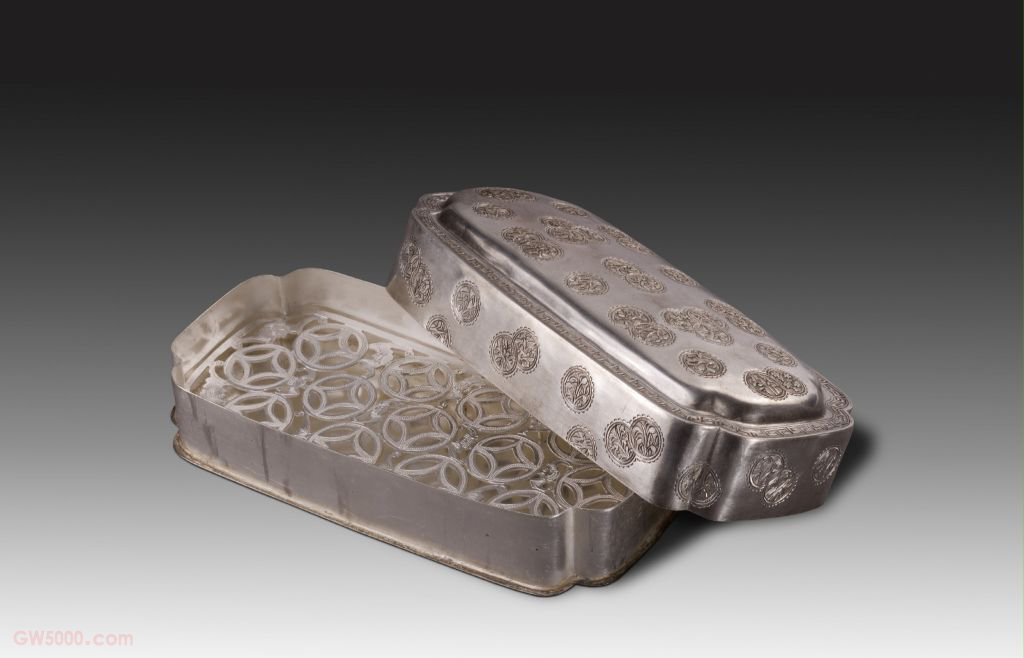 银錾花皮球纹长方盒,清,高4.3 厘米,长18.6 厘米,宽9.1厘米。 盒子为圆角长方体,四角内收,錾刻皮球纹覆满盖身,并以连续回纹装饰盖面四边。盒内有配套银箅子,以蝙蝠衔钱纹为箅格。 由此看来,此盒系加热蒸熟食物之用。 我国古代金工传统工艺之一。用小锤敲击各种大小不同的金属錾子,在金属表面留下錾痕,形成各种不同的纹理,使单一的金属表面产生多层次的立体装饰效果。此种工艺始于春秋晚期,盛行于战国,至今依然为匠师们沿用。 金属工艺的一种。即用工具剔除地纹,使纹饰轮廓线凸起。錾金工艺技法早在商代就已出现,到清代,被广泛地运用于各种金属工艺品上。家具上常用的纹饰之一,由陶器和青铜器上的雷纹衍化而来,寓意吉利深长,苏州民间称之为“富贵不断头”。在家具上,回纹主要作为边饰,用于边框、牙条、足端或束腰等处。家具上大量采用回纹见于清代。